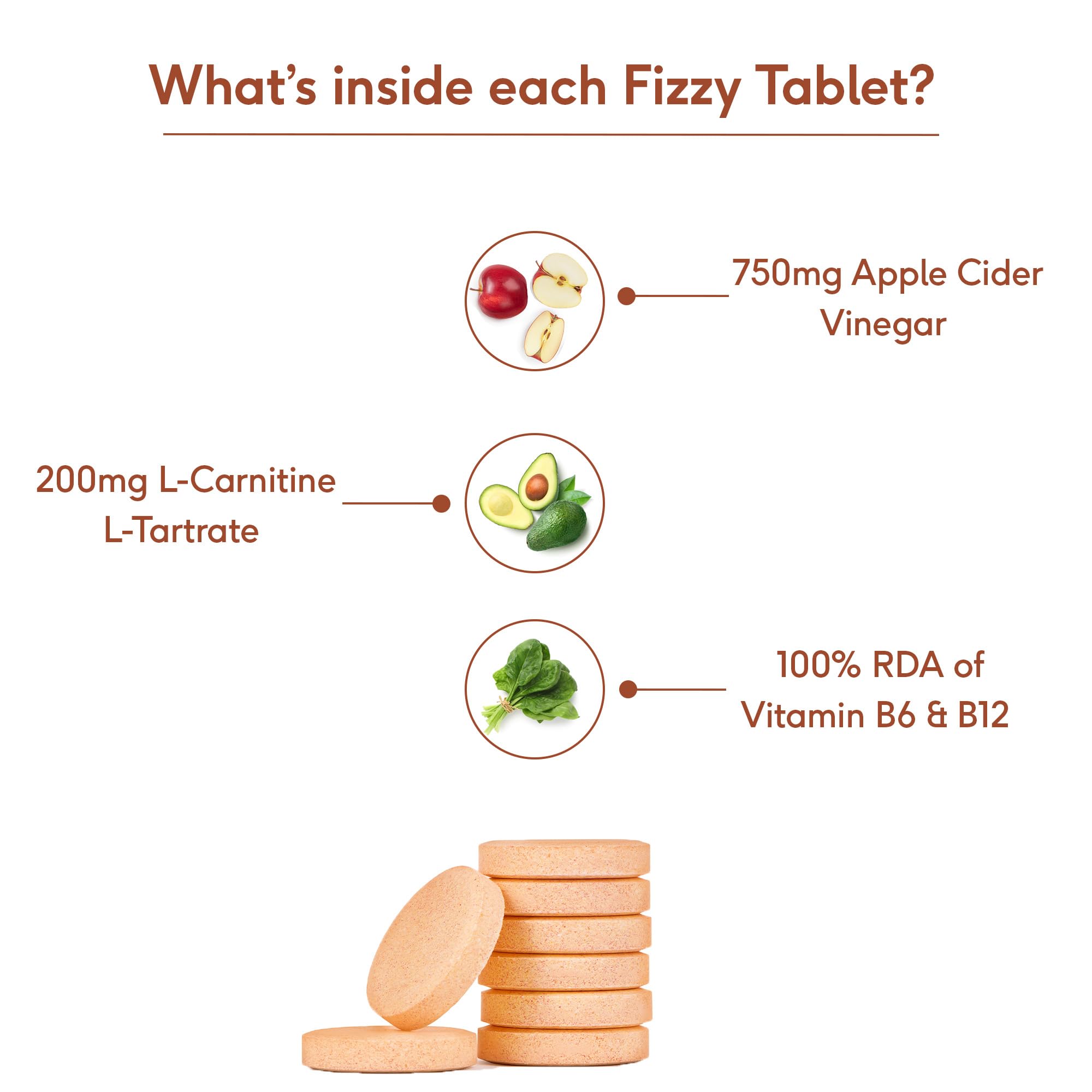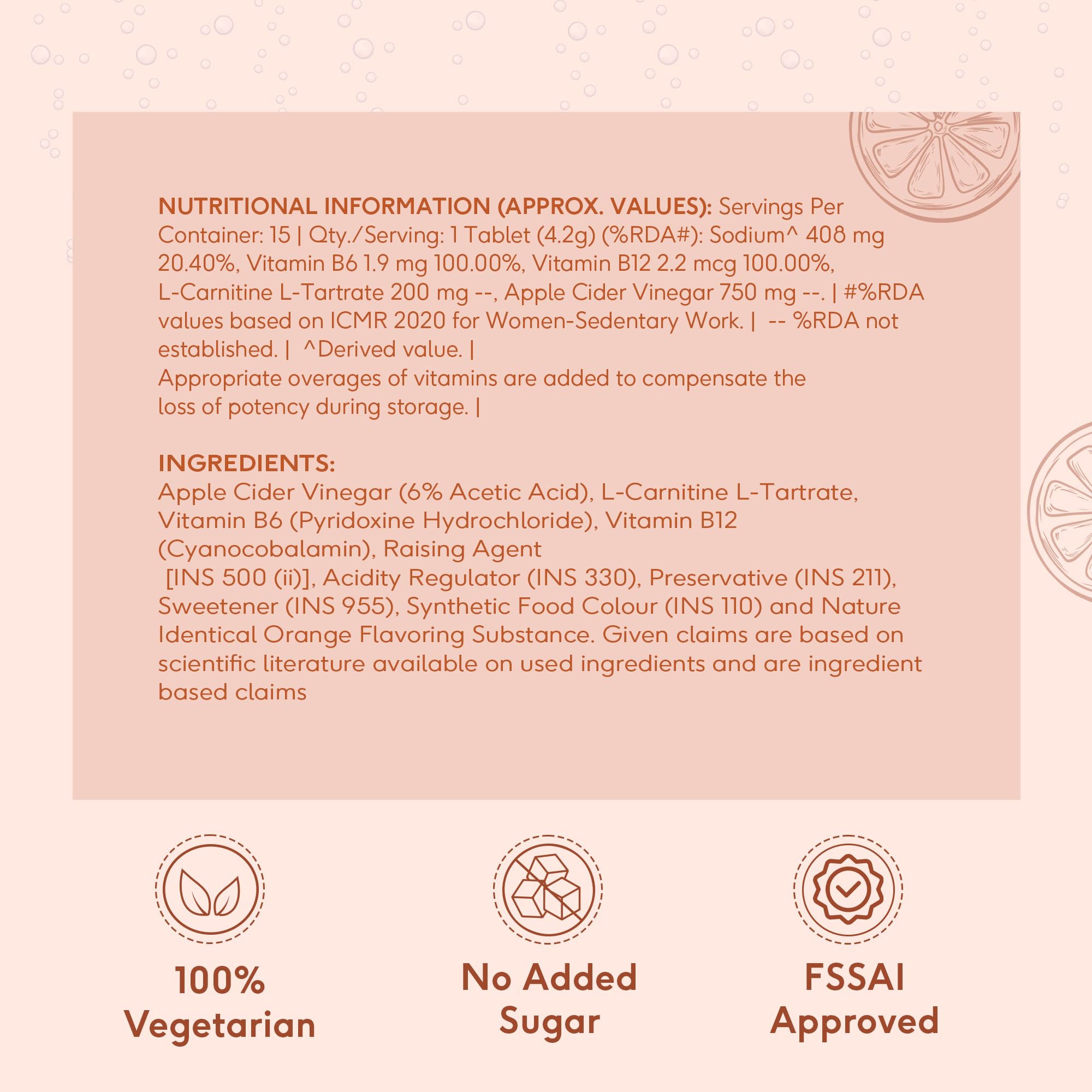 Dual action formula - HealthKart HK Vitals Apple Cider Vinegar + L-Carnitine makes it easier to reach your fitness goals. This potent supplement combines the dual benefits of 750mg Apple Cider Vinegar (ACV) and 200mg L-Carnitine in a convenient effervesce