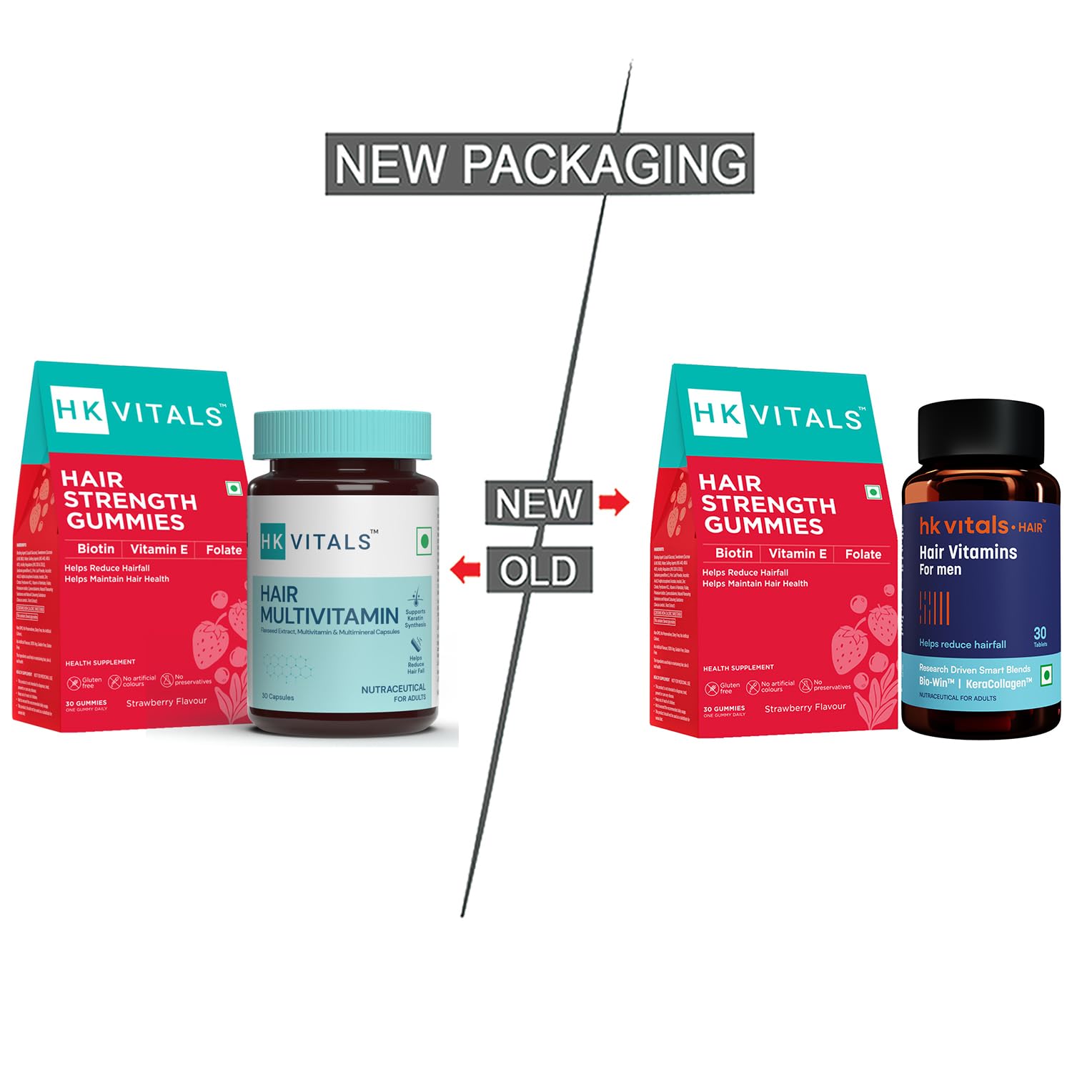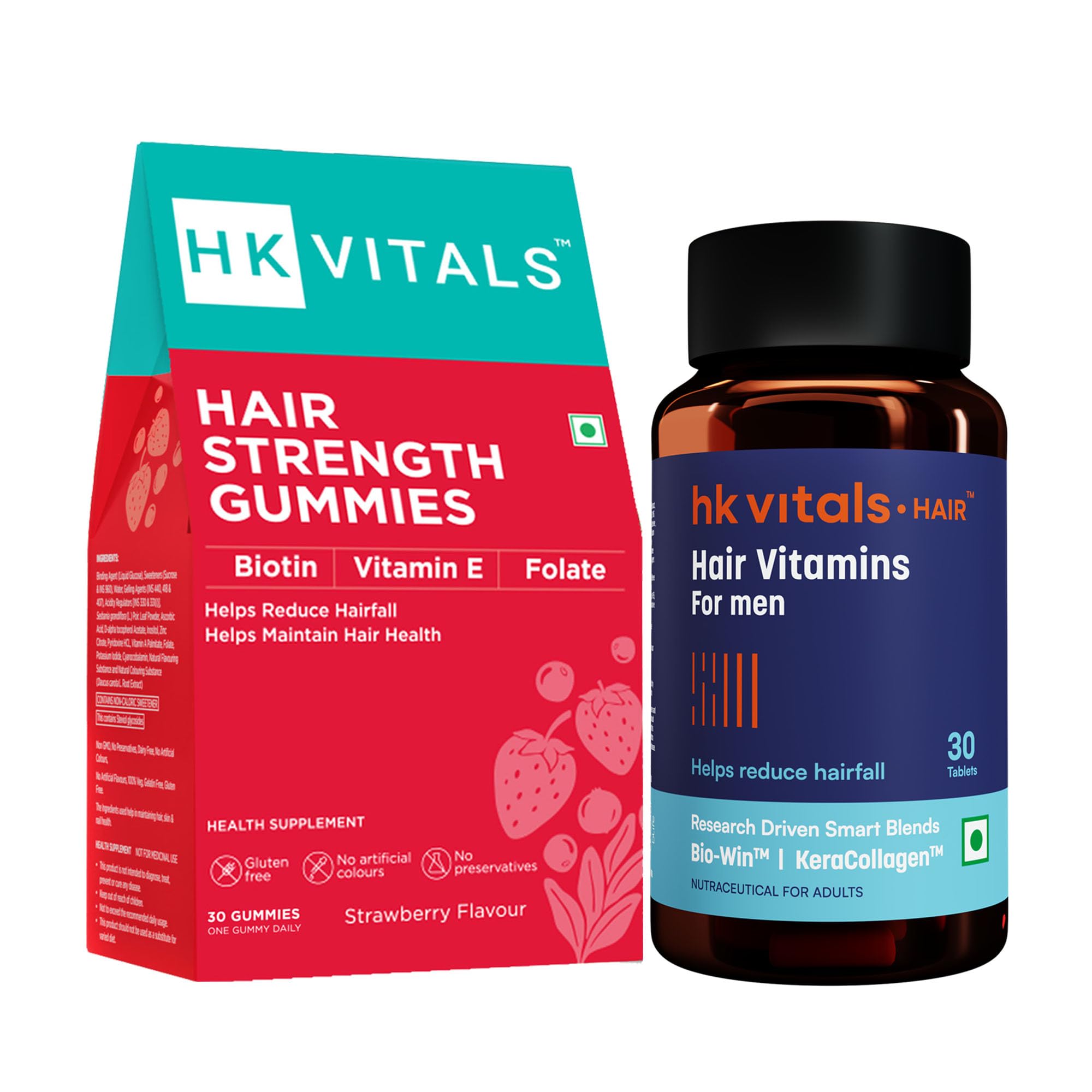 HealthKart HK Vitals Hair Multivitamin is a daily hair nutrition supplement that helps promote hair health and nourishment supports stronger hair & helps reduce hairfall. It is enriched with ingredients coming from sources of DHT Blockers & Omegas. It also has other good for hair vitamins and minerals like Biotin Iron Zinc & Folic Acid which support hair health. HealthKart HK Vitals Biotin Hair Gummies is a complete formula for your beauty needs. These biotin hair gummies include 100% RDA of biotin that helps boost hair growth and strengthens brittle nails. The blend of potent antioxidants like Zinc Vitamin E and Vitamin C helps combat oxidative stress on skin & hair. Additionally Vitamin A and Zinc have photo-protective qualities and protect the skin from UV-induced skin damage. Thus HK Vitals Biotin Gummies (from the house of HealthKart) is an all-rounder formula for hair skin and nails! Get these completely vegan and gluten free gummies with no added preservatives and artificial colours.