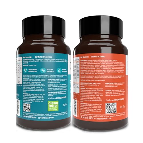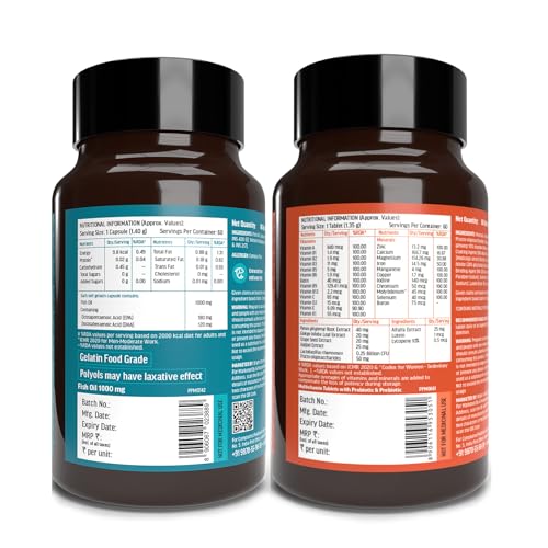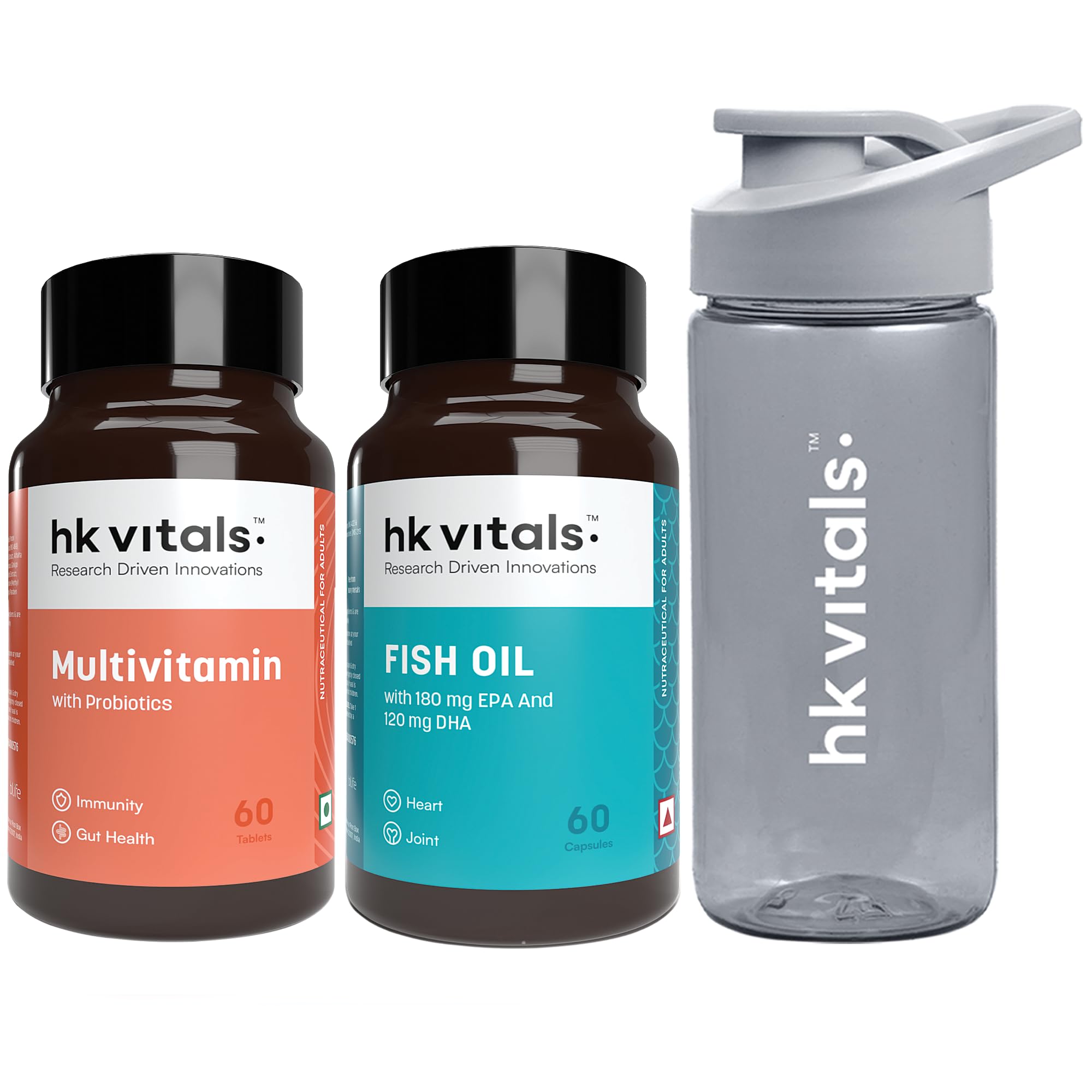 This HealthKart HK Vitals fish oil and multivitamin combo includes Fish Oil (1000 mg Omega 3 with 180 mg EPA & 120 mg DHA) and Multivitamin with Probiotics with 300 ml sipper. HealthKart HK Vitals Multivitamin with Probiotics is a combination of 13 vitamins 11 minerals probiotics Lactobacillus Panax Ginseng and Ginkgo Biloba. Probiotics Lactobacillus in these multivitamin tablets has a soothing effect on the digestive system. These multivitamin tablets help improve the overall energy of the body. Good Bacteria in combination with Vitamins A D C E B6 and B12 folate zinc iron copper and selenium help boost immunity by allowing immune cells to respond better. Panax Ginseng and Ginkgo Biloba may boost the cognitive function of the brain. This helps in managing stress and improving the quality of life. HealthKart HK Vitals Fish Oil Omega 3 consists of 1000 mg bioavailable fish oil with 180 mg EPA and 120 mg DHA to help improve joint flexibility heart health brain health and eye health. Omega 3 in fish oil capsules is extracted from high-grade cold water fishes sourced from Antarctica. It is ultra-pure and micro-filtered. These fish capsules for men and women are Non-GMO and have an anti-reflux formula that ensures better absorption of essential fatty acids so that you get the most out of your fish oil supplements. These fish oil capsules leave no aftertaste or fishy burps.