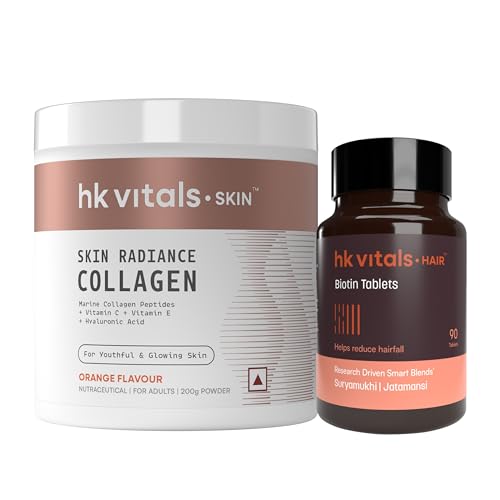 Collagen and biotin supplements complement each other. Get this HealthKart HK Vitals combo that includes Skin Radiance Collagen and Biotin. HealthKart HK Vitals Skin Radiance Collagen is a comprehensive formula for skin hair and nail health. It contains TITAGEN-Fish Collagen Peptide Hyaluronic acid Vitamin C Vitamin E and Biotin. It is available in a delicious orange flavour. The marine collagen content of HK Vitals Collagen (from the house of HealthKart) helps improve the firmness & elasticity of the skin. Hyaluronic acid which is natureâs moisturizer helps keep the skin soft and smooth. Potent antioxidants like Vitamin C and Vitamin E help improve skin glow and control free radical-induced skin damage. Further biotin included in this collagen supplement for men and women helps maintain nail and hair health through its role in keratin protein synthesis. HealthKart HK Vitals Biotin is a Vitamin B7 dietary supplement that assures your body of the required dosage of Vitamin B7 which is essential for keratin synthesis and building keratin infrastructure in your body. Biotin helps in hair growth provides radiance to the skin and fights nail brittleness. It metabolises fats and protein to provide energy and fight fatigue. Consume one biotin tablet daily or as suggested by your dietician.