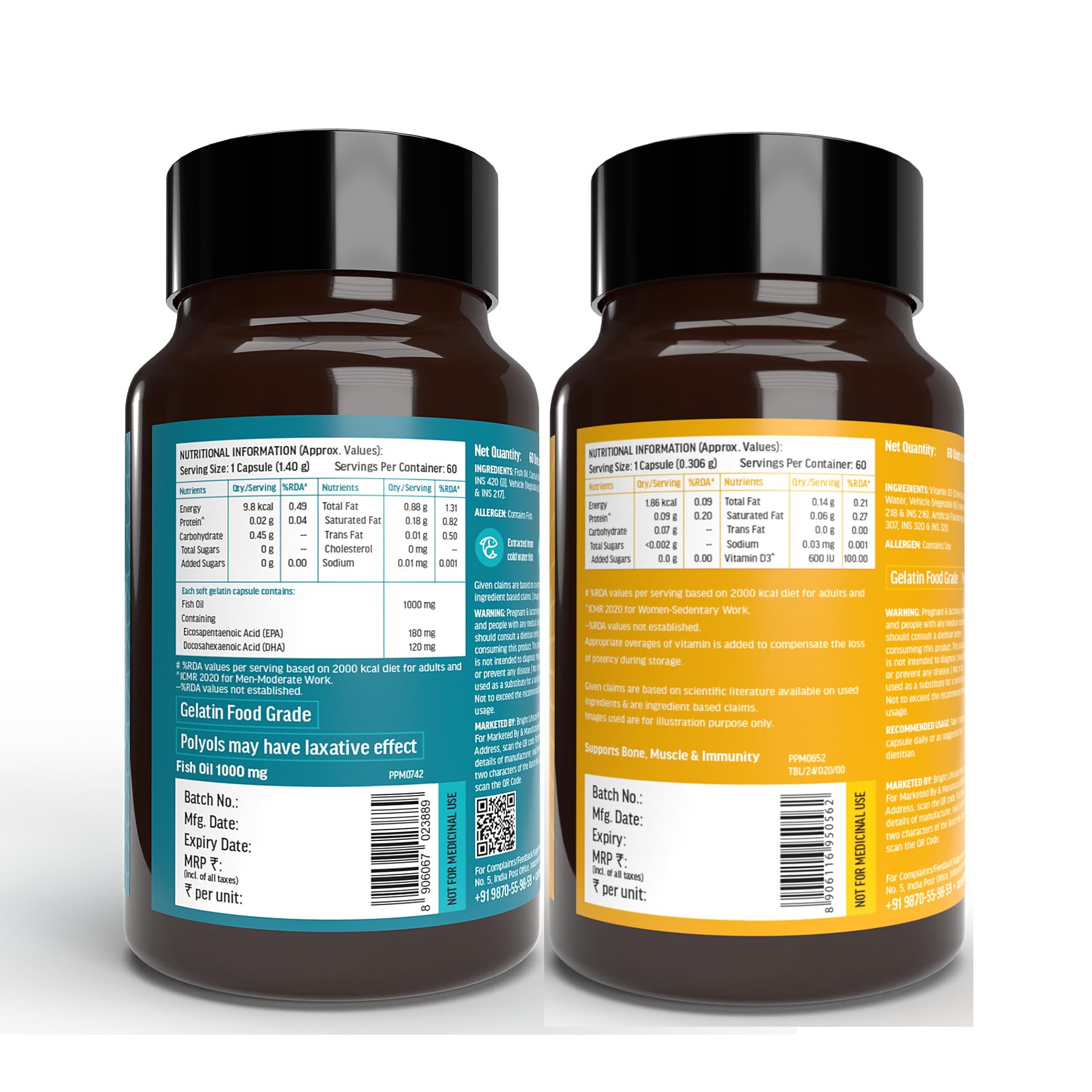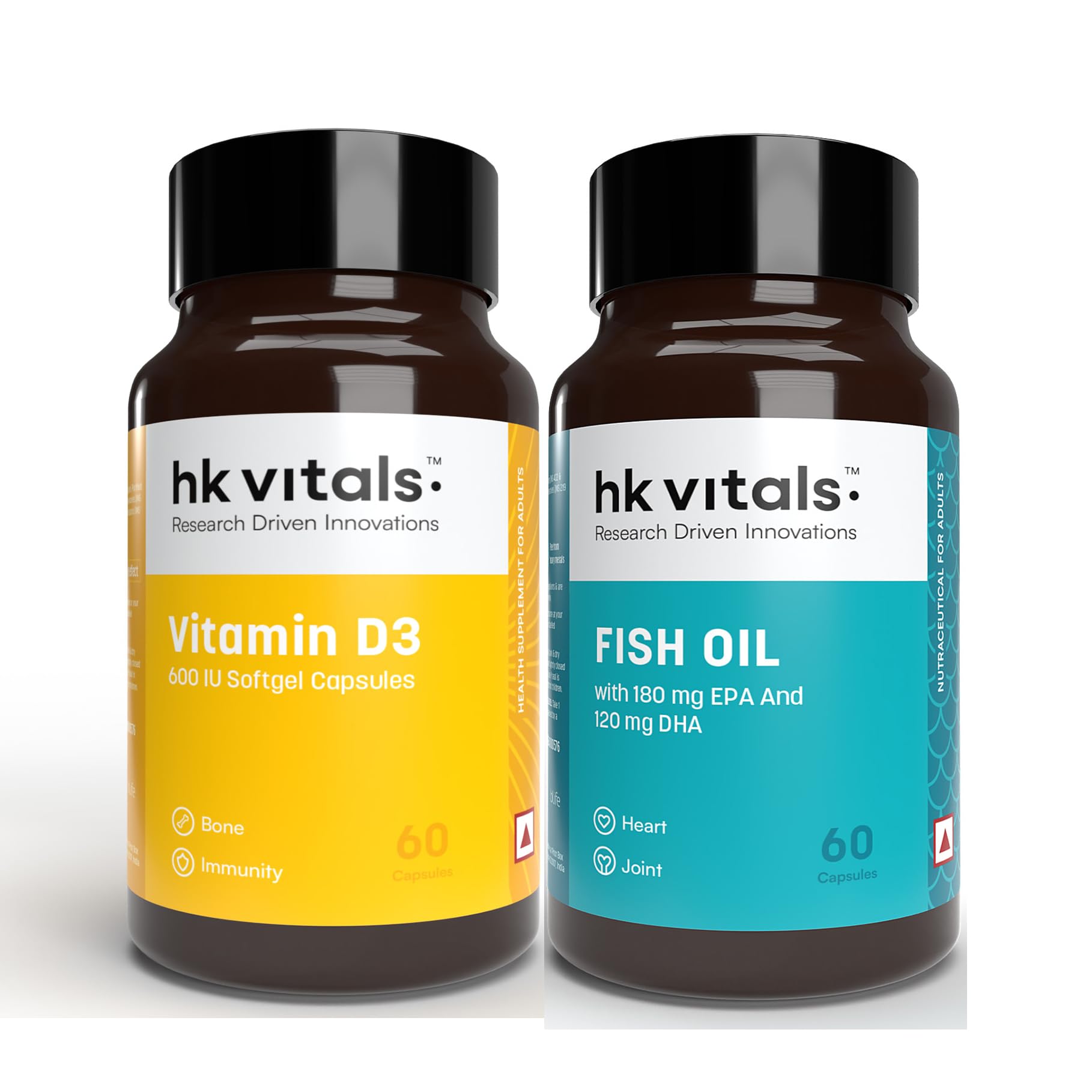 HealthKart hk vitals Vitamin D3 (600 IU) & Fish Oil (1000mg Omega 3 with 180mg EPA & 120mg DHA) (60 Tablets Each) | Combo Pack
