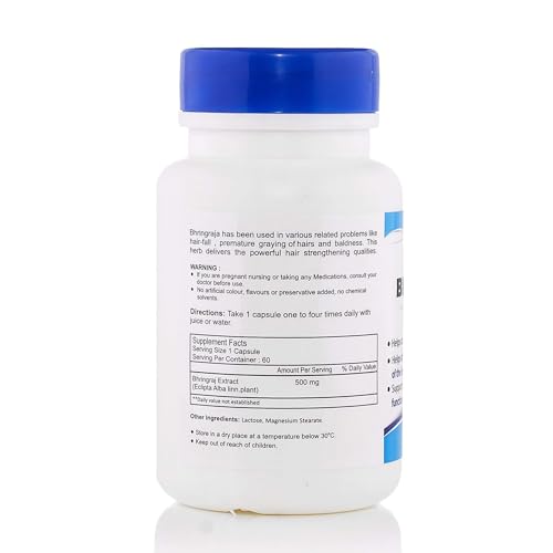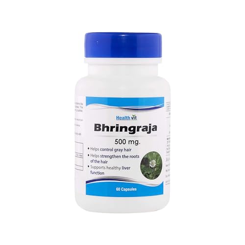 Review For Healthvit Bhringraja 500 mg - 60 Capsules Bhringaraj is well known in Ayurveda for its use as a natural hair tonic. It is key ingredient in most Ayurvedic hair oils. Bhringaraj work as an aid to strong, healthy hair growth and helps maintain the hair's natural color and luster. It is a rejuvenatives for pitta. Healthvit Bhringaraja helps fortify the healthy nails, bones, teeth and a clear complexion.Bhringaraj helps cleanse liver and supports proper function of the lungs. Key Benefits : - 1.It has been used in various hair related problems like hair-fall, premature greying of hairs and baldness 2. This herb delivers the powerful hair strengthening qualities 3.Great pills. See the improvement in 3 weeks! 4. It is good for the liver Liver, one of the largest organs in the body, performs the function of removing toxins from the body. Bhringaraj offers protection to the liver from harmful chemicals that can damage it. Demethyl-wedelolactone and wedelolactone are certain compounds in bhringaraj which perform anti-toxic activities which contribute to regenerating liver cells.