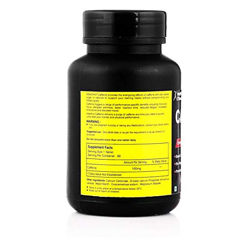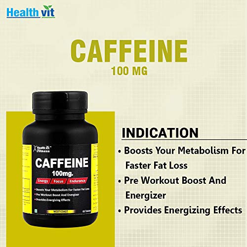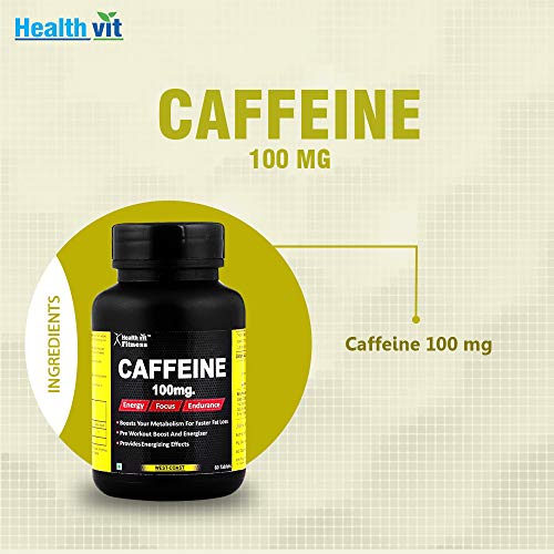 Healthvit fitness caffeine 100 mg - 60 tablets (energy focus and amp; endurance)Healthvit caffeine provides the energizing effects of caffeine with zero added sugar or calories to support your training needs without compromising your dietary goals. Caffeine triggers a range of performance-specific benefits including improved focus elevated alertness faster reaction time reduced fatigue increased endurance and elevated mood. Healthvit caffeine delivers a surge of caffeine any time you need to quickly jump start your mental and physical performance. Boosts your metabolism for faster fat losspre workout boost and energizer provides energizing effects ingredients: maize starch and amp; dibasic calcium phosphate purified talc colloidal silicon dioxide croscarmellose sodium magnesium stearate caffeine suggested use: one tablet daily or as per the requirement or as per direction of physician.