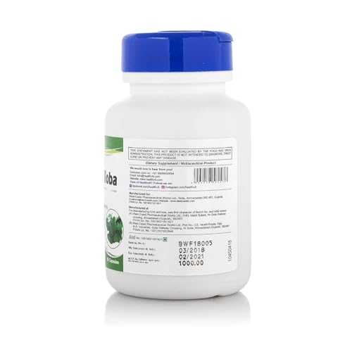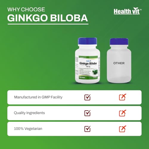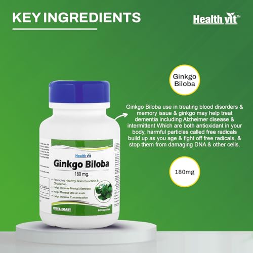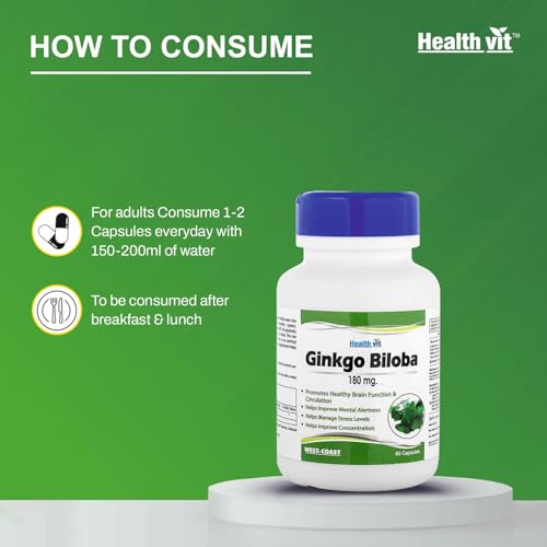 Healthvit Ginkgo Biloba 180mg For Healthy Brain Function | Manage Stress Levels | Improve Mental Alertness | Improve Concentration - 60 Capsules