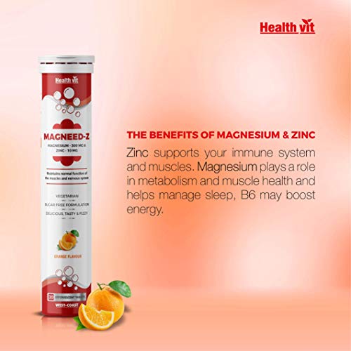 Healthvit Magneed-Z Magnesium 300mg & Zinc 10mg for Muscle Health 20 Effervescent Tablets (Orange Flavour) Magnesium and Zinc is a bones health supplement scientifically formulated to provide bone support nutrients as well as those that help in nerve muscle and metabolic reactions. Magnesium helps prevent calcification of soft tissue which helps in preventing bone loss. It helps with calcium absorption. Zinc is for added mineral support which is vital in bone formation as well as regulating appetite maintaining eye health and immunity. 1. Helps provide muscle energy reduce muscle cramps and spasms 2. Helps defeat daily stress fatigue & exhaustion 3. Contributes to Maintain bone health [Ingredients:] Magnesium 300mg Zinc 10mg [Direction for use:] 1.Drop a tablet in 200 ml of water 2.Wait till the effervescent tablet dissolves completely. (2 min.) Stirring not required. 3. Enjoy the great tasting fizzy orange health drink. [Recommended Dosage:] 1 tablet per day or as directed by a healthcare practitioner.