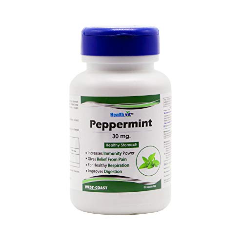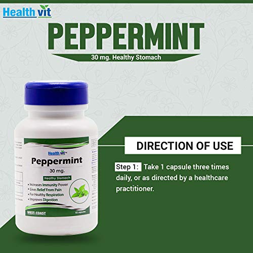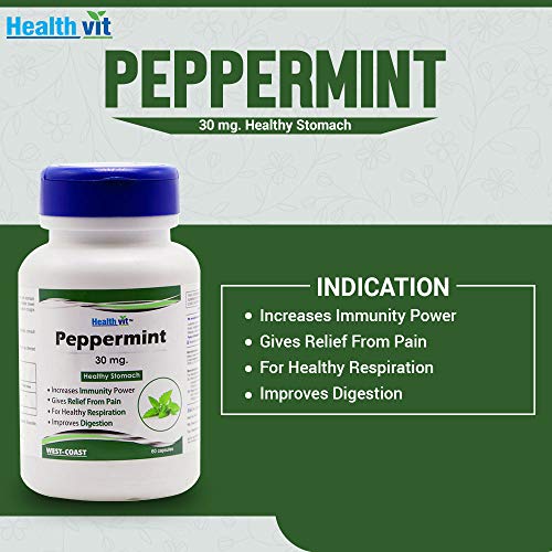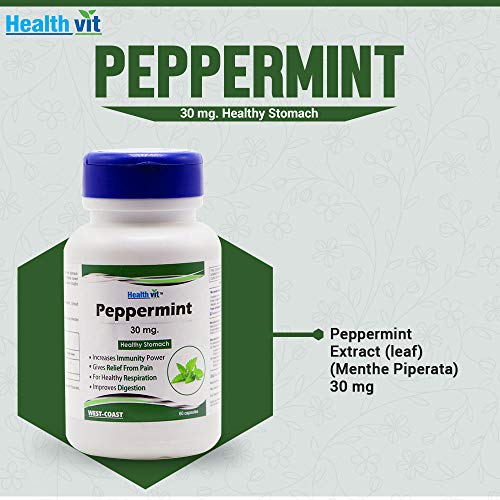 Healthvit Peppermint 30 mg CapsulesHealthy Stomach, 60 pcs:-Composition:-Peppermint Extract (Leaf) (Menthe Piperata) 30 mg*Features*IMPROVES DIGESTION:-Cleanses the body naturally and helps in maintaining a healthy digestive system.It normalizes the elimination process and helps to keep the body healthy.BOOSTS THE IMMUNE POWER:- It also supports the immune system to help strengthen your natural defense system against a wide variety of disease and illnesses.RELIEVE TENSION HEADACHES AND MIGRAINES:- As peppermint acts as a muscle relaxant and pain reliever, it may diminish certain types of headaches.Indigestion: Peppermint calms the stomach muscles and improves the flow of bile.How to Use:-Take 1 capsule three times daily, or as directed by a health care practitioner.