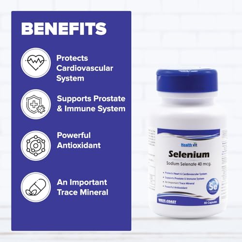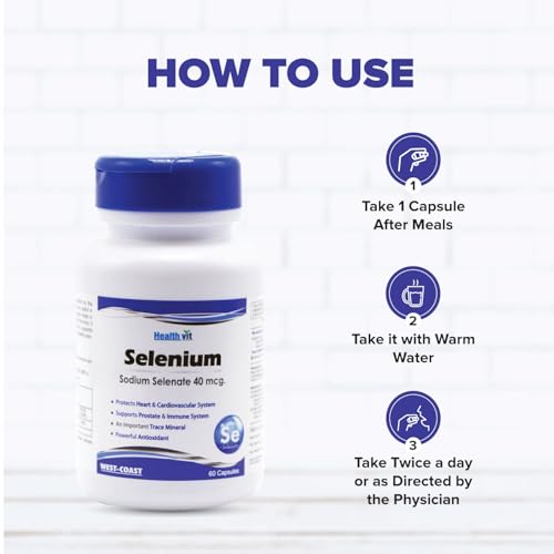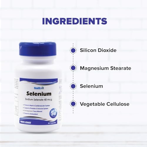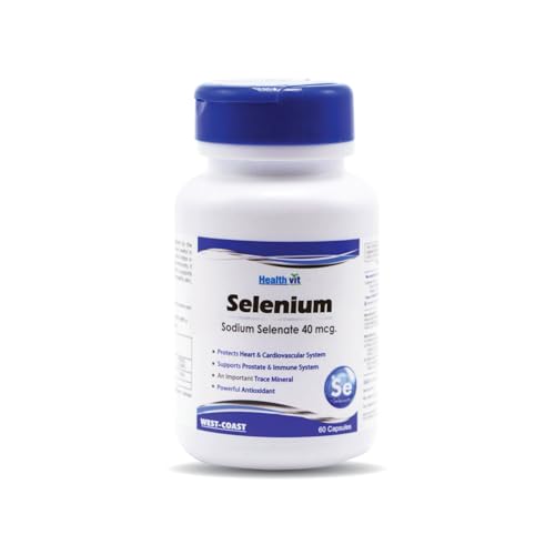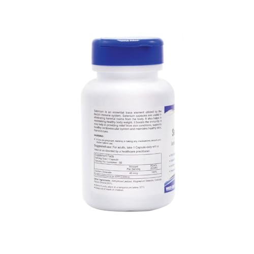 Healthvit selenium 40 mcg for immune system support- 60 capsules. Selenium is an essential trace element utilized by the body's immune system. Selenium capsules are useful in eliminating harmful toxins from the body. It also helps in maintaining healthy body weight. It boosts the immunity. It may help in providing relief from skin conditions supports healthy cardiovascular system and maintain healthy skin hair and eyes. 1. Protects heart and cardiovascular system. 2. Supports prostate and immune system. 3. An important trace mineral. 4. Powerful antioxidant. Ingredients: Sodium selenate 40 mcg. Suggested use: For adults take 1 capsule daily with a meal or as directed by a healthcare practitioner.