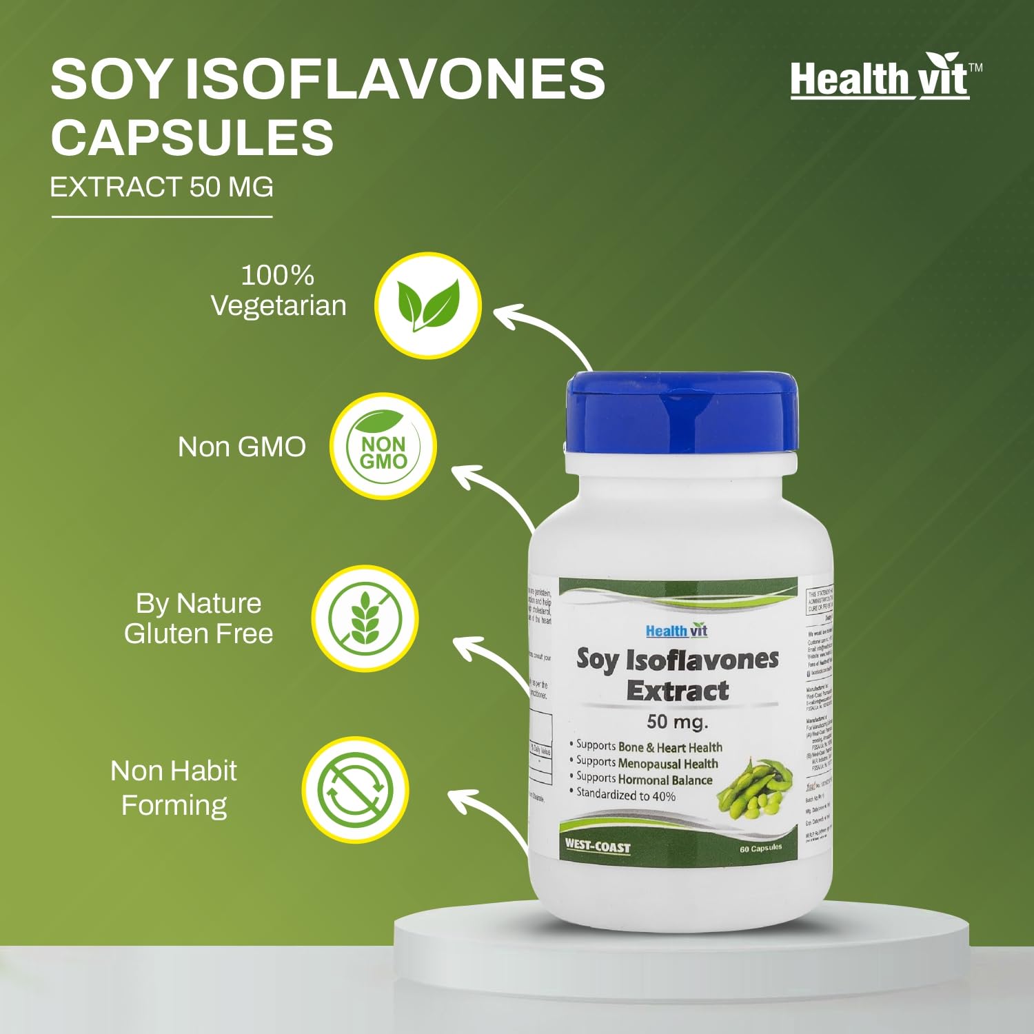 Healthvit the three major isoflavones found in soybeans are soybeans are genistein daidzein and glycitein may inhibit bone resorption and help stimulate bone formation. Soy is used for high cholesterol high blood pressure and preventing diseases of the heart and blood vessels. Supports hormonal balance. Supports menopausal health. Supports bone and heart health. Standardized to 40 percent.