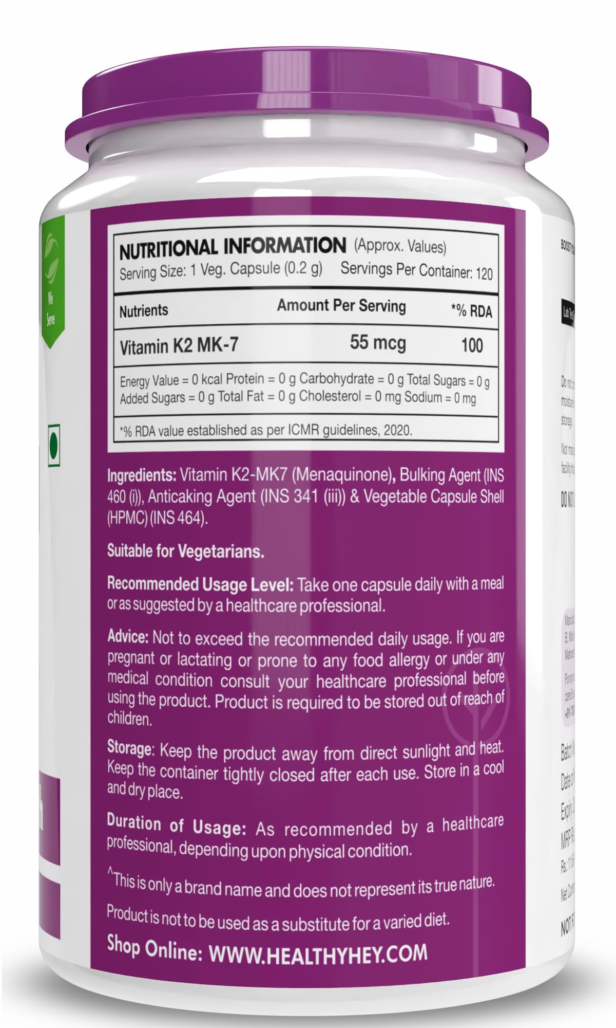 Healthy Hey Nutrition vitamin K2 | 100% Vegetarian Vitamin K2 Benefits in Bone Health - 55mcg - 120 Vitamin K27 Capsules