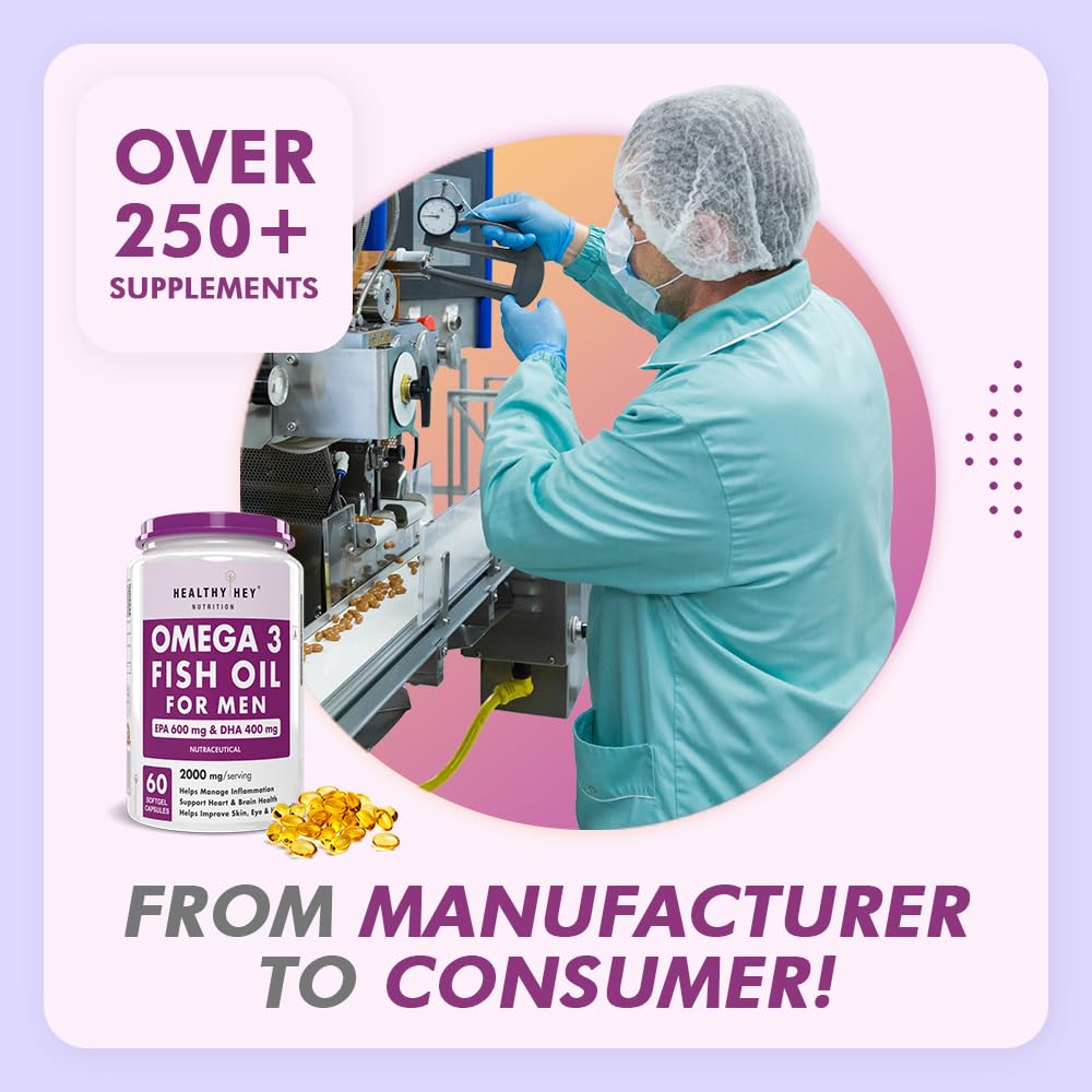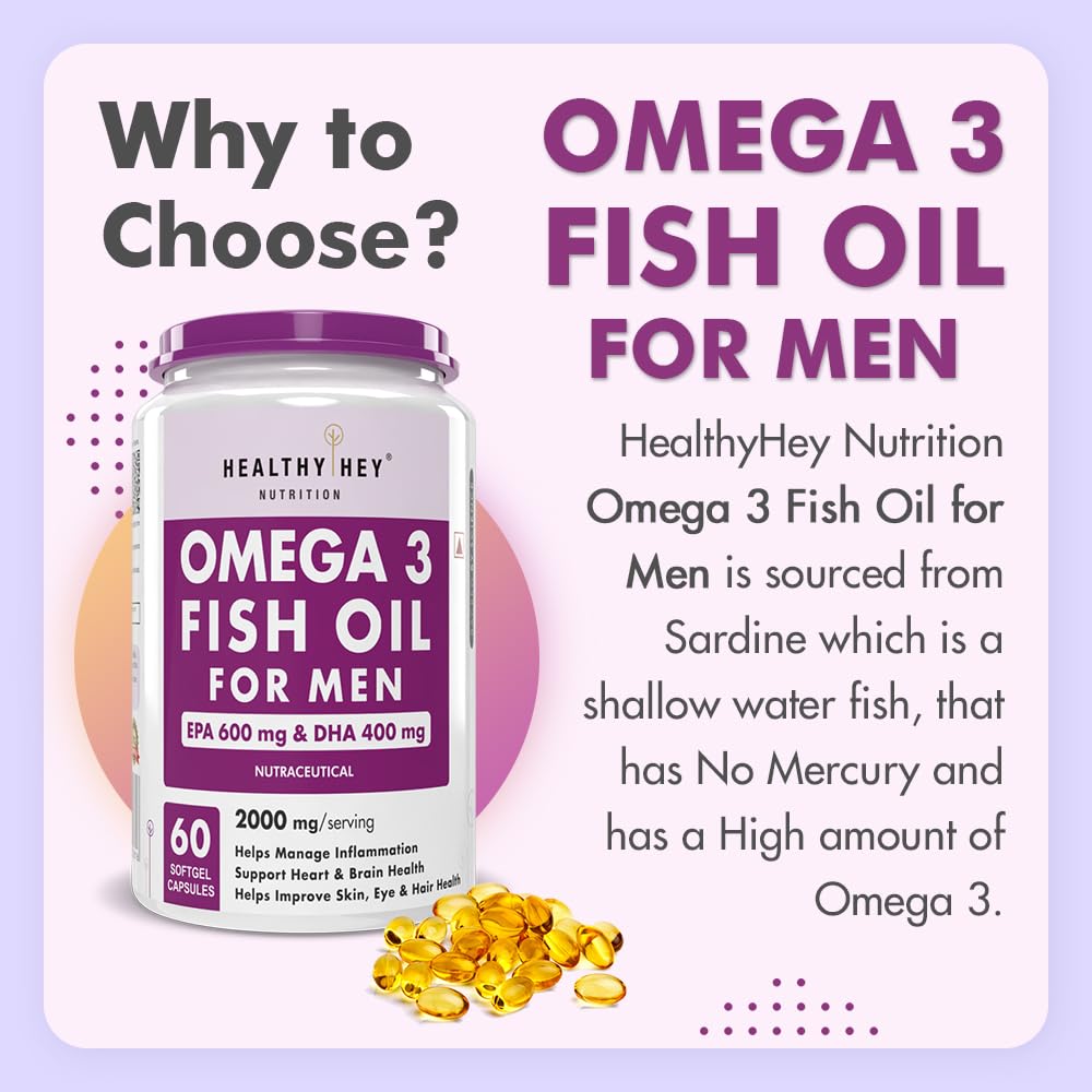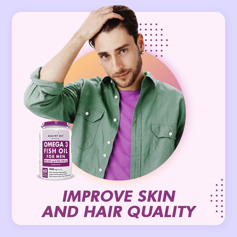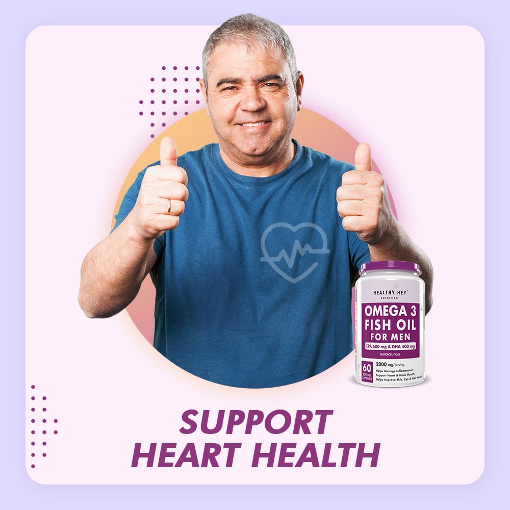 HealthyHey Nutrition Omega 3 Fish Oil for Men - 2000 Mg/serving - 60 Softgel Capsules (600 EPA & 400 DHA)