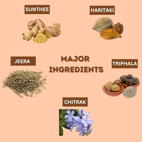 Each film coated tablet contains ajma churna 50mg belgarbha ghana 50mg indrajav churna 50mg jeera churna 50mg kutaj ghana 50mg shunthi churna 50mg triphala churna 100mg chitrak ghana 50mg haritaki 100mg trikatu kadha amlavetas quath excipients: magnesium stearate starch silicon dioxide xanthan gum color coat.