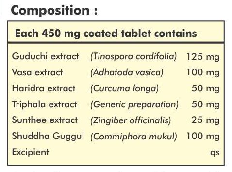 Each Tablet contains Guduchi Extract 125mg Vasa Extract 100mg Haridra Extract 50mg Triphala Extract 50mg Sunthee Extract 25mg Shuddha Guggul 100mg Excipients: Xanthan Gum Silicon dioxide Starch Magnesium stearate HPMC (Seal Coat).