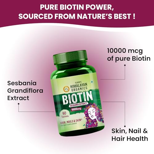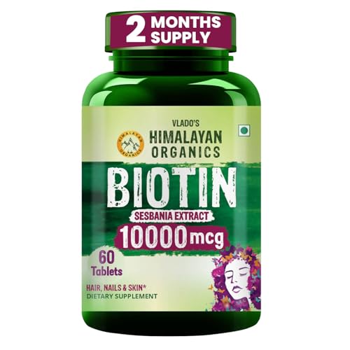 Vlado’s Himalayan Organics Biotin 10000mcg Supplement for Hair Growth, Strong Hair and Glowing Skin, Nail I High Potency biotin tablets For Men & Women - 60 Veg Tablets
