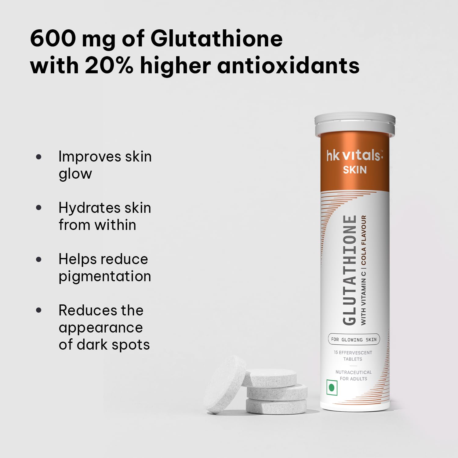 Introducing hk vitals Glutathione Effervescent fizzy tablets that deliver a powerful blend of 600mg L-Glutathione Vitamin C & E. L-Glutathione is a powerful antioxidant which along with Vitamin C & E helps reduce skin dullness and promotes skin glow. Glutathione also helps reduce pigmentation and dark spots by regulating melanin production. One glutathione tablet daily will help improve your skin glow & reduce pigmentation.