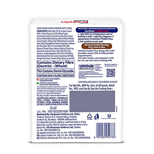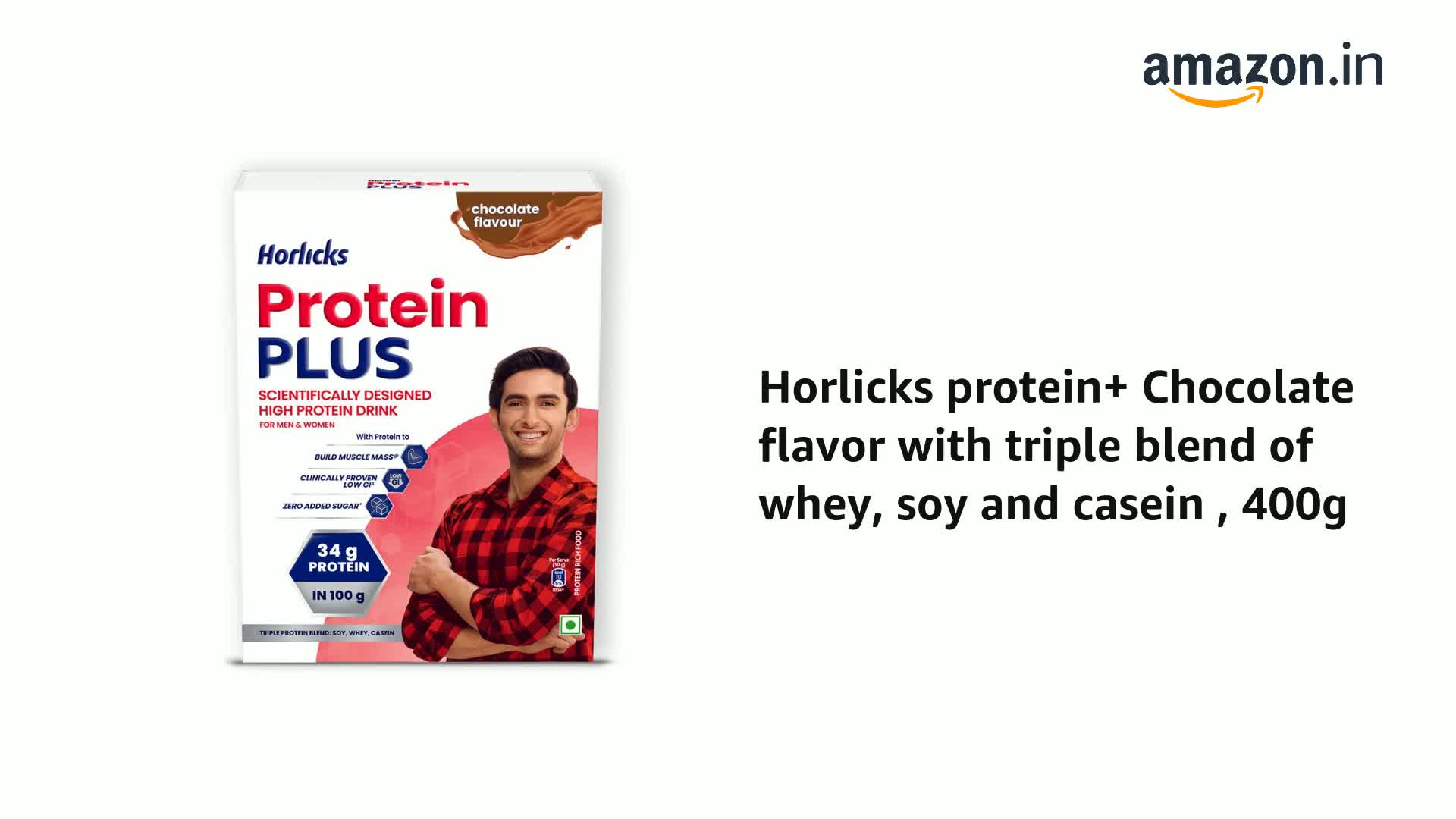 Did you know that âAdults need 1 gram of protein per kilogram of body weightâ. Add Horlicks Protein Plus to your daily diet to help meet your daily protein needs. It delivers 34 g protein in 100 g of the product. It is rich in proteins which help to maintain muscle and support strength. To maintain muscle mass|| one does not just need the right amount of Protein but also the right quality. The quality of Protein can be measured by something called PDCAAS. Whey|| Soy and Casein|| the Proteins in Horlicks Protein Plus all have a PDCAAS score of 1|| the highest score possible on this scale. There are 20 Amino Acids and your body needs all of them to maintain muscle mass and strength. But 9 of them cannot be made in the body and so need to be consumed through diet. These are called essential Amino Acids. Horlicks Protein Plus contains 3 high quality proteins which include fast acting whey|| intermediate acting soy protein and slow acting casein. The 3 Proteins in Horlicks Protein Plus contain all the essential Amino Acids needed to build and maintain muscle mass|| important for strength. Horlicks Protein Plus is a nourishing beverage to be consumed as a part of regular and varied diet. ICMR RDAs 2010 for protein (sedentary adult men). Blend of 3 good quality proteins(whey|| soy|| casein). *OLD