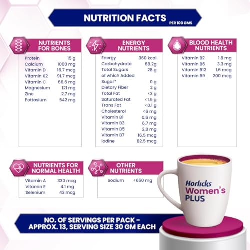 Bones form the structural framework of the human body. Up until the age of 30 bone formation is faster than bone loss which causes the skeleton to grow both in size and density resulting in an overall increase in bone mass. After the age of 30 bone mineral density may start to decrease. Unfortunately there are no visible signs of weak bones. They often go unnoticed over many years with no symptoms or discomfort until a bone breaks. To maintain strong bones you donât just need an adequate intake of Calcium but also Vitamin D for Calcium absorption and Vitamin K2 for binding Calcium to bones daily. Remember Vitamin K2 is not commonly found in the Indian diet and Vitamin D is not even available in your daily diet. Horlicks Womenâs Plus is a bone nutrition specialist powered with CALSEAL formula. It provides 100% RDA^ of Calcium Vitamin D & Vitamin K2 requirements. NIH Osteoporosis and related bone diseases national resource center Ref: Malhotra N and Mithal A. Osteoporosis in Indians. Indian J med res 127 march 2008 pp 263-268 Unique combination of Vitamin K2 Calcium and Vitamin D to support bone health. In 2 serves (60 g) as per ICMR 2010 Guidelines on Women. Added sugar refers to Sucrose.'CONTAINS NATURALLY OCCURRING SUGARS'. Horlicks Womenâs Plus is a nourishing beverage to be consumed as a part of regular diet.