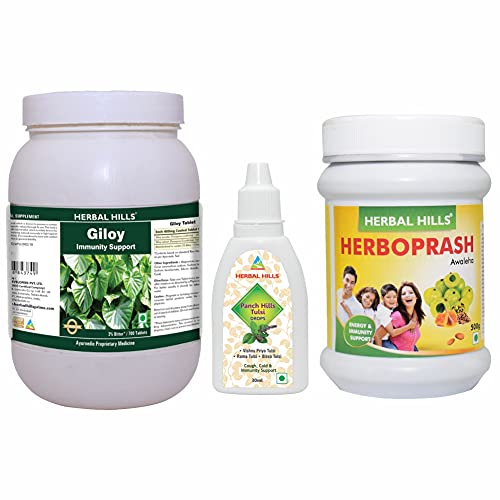 HERBAL HILLS Immunity Support Combination of Panch Tulsi 30ml drops Giloy 700 Tablets Herboprash Awaleha Chyavanprash 500g