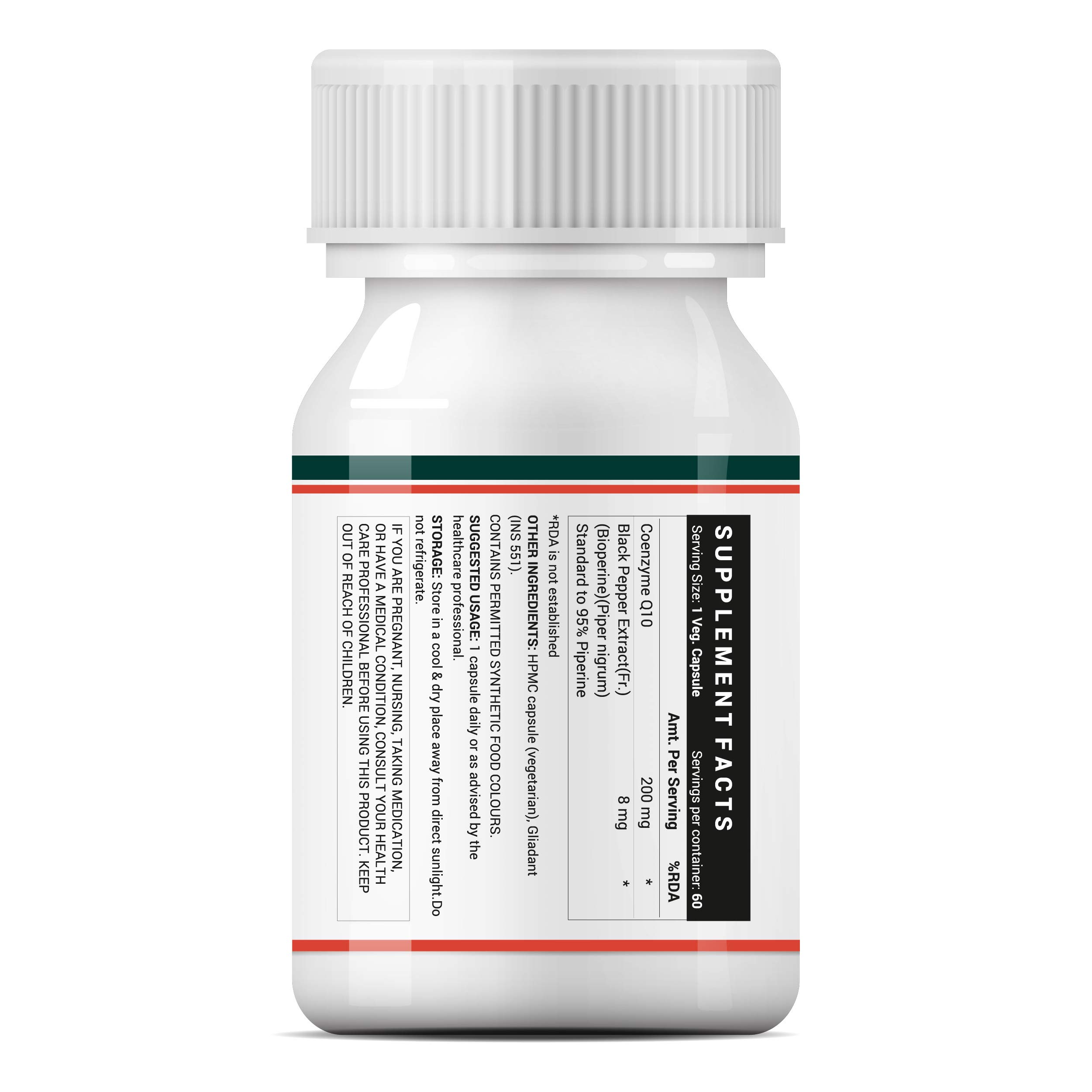 • Each capsule contains 200mg Coenzyme Q10 (CoQ10) along with Bioperine – Piperine 8mg.