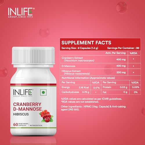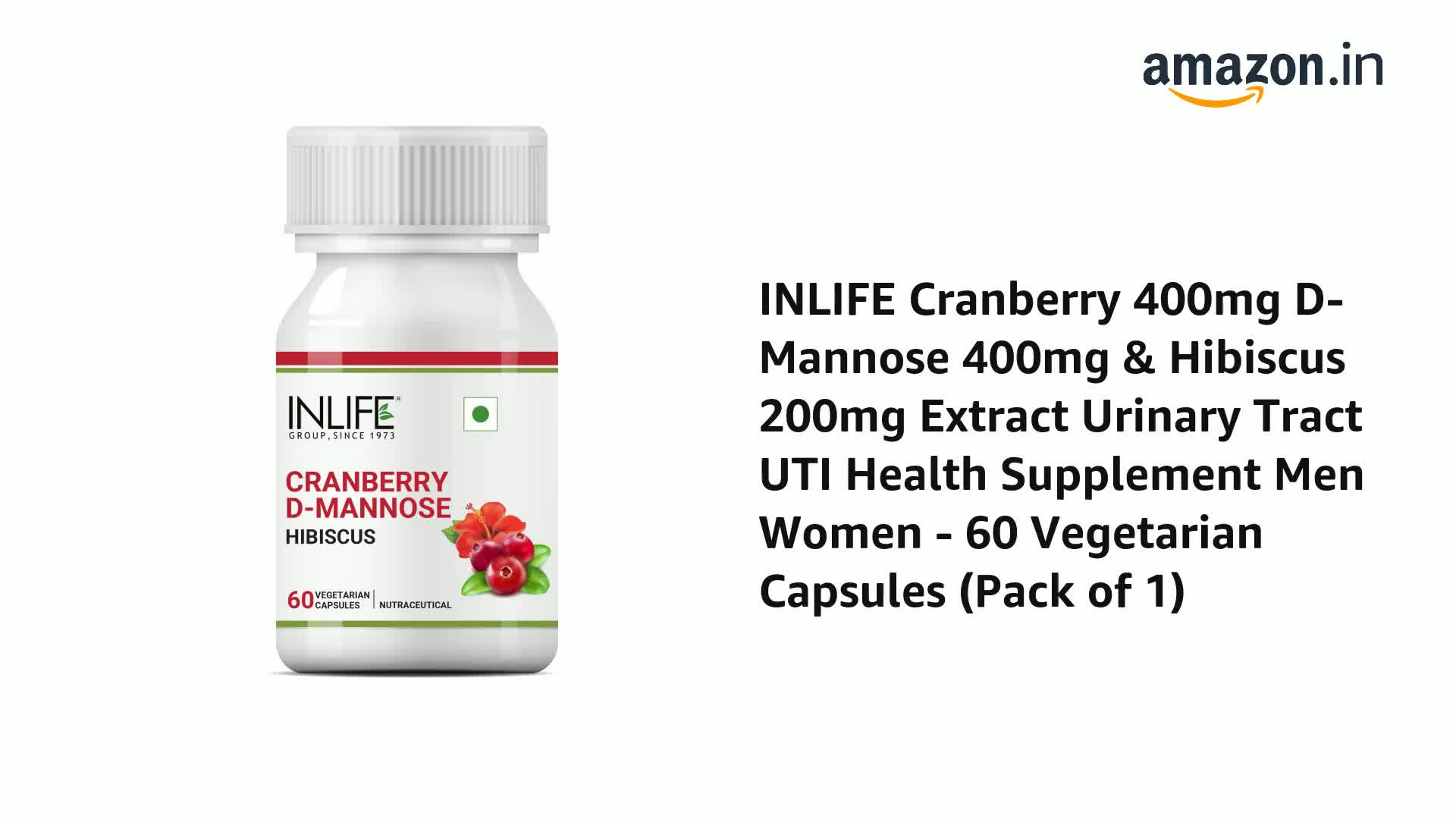 D-mannose cranberry & hibiscus: a potent and unique formula supports uti kidney cleanse and ph balance. Dmannose is a naturally occurring simple sugar that your body utilizes to support bladder health. Support overall urinary tract health: this urinary support supplement combined with sufficient water intake and combined with your healthy diet may also prevent uti or its recurrence by preventing what causes uti from adhering to urinary tract lining. Potent formula: each serving contains 400mg of d-mannose 400mg of cranberry extract and 200mg of hibiscus extract. Take 2 capsules (1 serving) daily after meals with water or as directed by your healthcare professional. Natural ingredients & gmp certified: our product contains the most natural and effective formulation of trusted natural ingredients that are carefully processed and manufactured in a gmp certified manufacturing facility so you can be sure that you're safe. Vegan & vegetarian friendly: inlife cranberry hibiscus & d-mannose supplement is encapsulated in a gluten free vegetarian capsules.