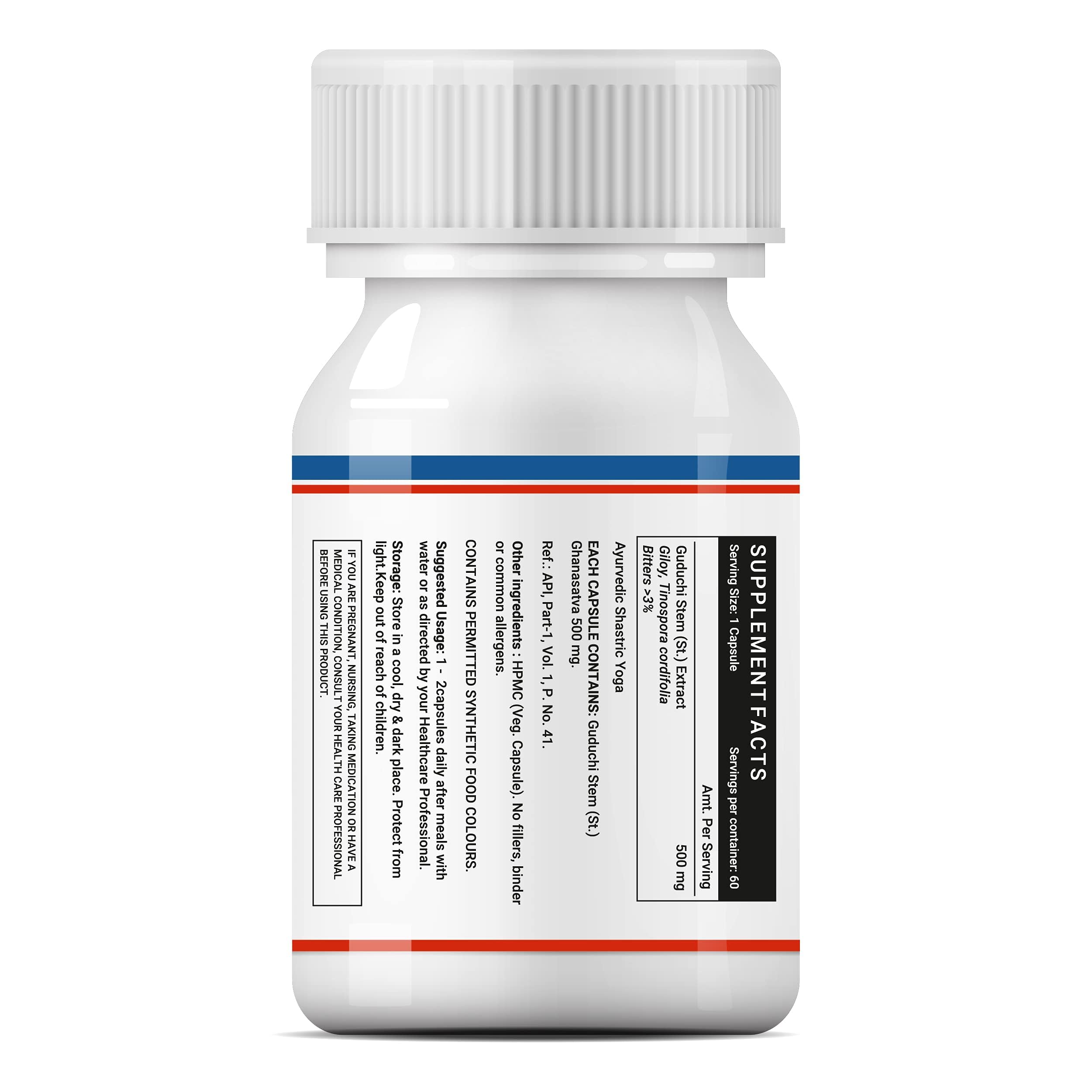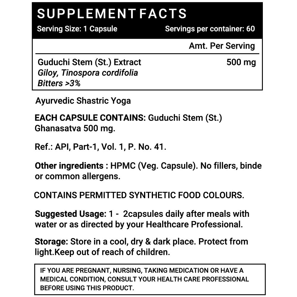 • Standardized Extract: Each capsule delivers 500mg of Guduchi (Tinospora Cordifolia) stem extract standardized to over 3% bitters.