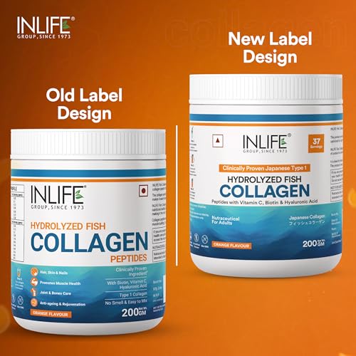 Clinically Proven Ingredient: INLIFE Hydrolyzed Fish Collagen is manufactured using Clinically Proven Type 1 Fish Collagen Ingredient. It is also known as marine collagen powder that provides 18 essential amino acid crucial for human body and health. Hydrolyzed Form: Fish Collagen Peptides are manufactured from the scales of the fish. The collagen peptides are optimized for high bioavailability and the hydrolyzed form makes it easily digestible for humans. Benefits: INLIFE Fish Collagen Powder is fortified with Hyaluronic Acid Biotin and Vitamin C thereby providing premium nutritional building blocks required to promote healthy hair skin and nails. It is major source of protein for connective tissues thereby it is useful in muscle building to promote joint & knee health and skin care. Suggested Usage: Add 1 to 2 levelled scoops of INLIFE Hydrolyzed Fish Collagen Peptides in 75ml to 150ml of water. Stir well until the powder is evenly dispersed in water & drink. Ingredients: Type 1 Hydrolyzed Fish Collagen Biotin Vitamin C & Hyaluronic Acid. Available in a bottle packing of 200 grams. Offered in three flavours: Orange Blueberry and Strawberry Lemon flavour. Store in a cool dry and dark place.