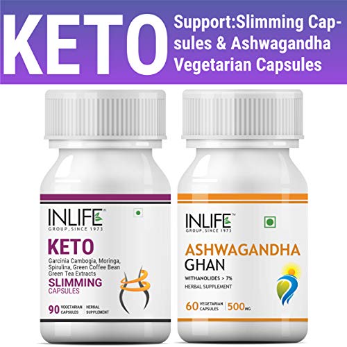 The keto diet isn't new and it's been around for nearly a century. Eating a lot of fat and very few carbs puts you in ketosis a metabolic state where your body burns fat instead of carbs for energy. When your body is unable to get glucose from carbs your liver converts fatty acids from your diet into ketones an alternative source of energy. Once you achieve the state of ketosis the most challenging is its maintenance as your body might crave for carbohydrates and its very essential to take such ingredients which helps to control the cravings. Along with these it is very much important that one is fit and does not feel upset and sad of being deprived from favourite food. INLIFE Keto support combo consist of INLIFE Slimming supplement capsules and INLIFE Ashwagandha capsules. INLIFE Slimming supplement contains bioactive substances like caffeine and EGCG can have powerful effects on fat metabolism that stimulates the breakdown of fat with inherit benefits towards weight management which makes it a part of keto kit INLIFE Ashwagandha capsules can help the body to keep levels of the â¬Åstress hormone ⬠in check thus helps in protecting the body while it is on ketosis. This combo will help you sustain your keto diet and helps by speeding up on how quickly you get into ketosis controlling appetite cravings increasing energy improving moods and fighting Inflammation.
