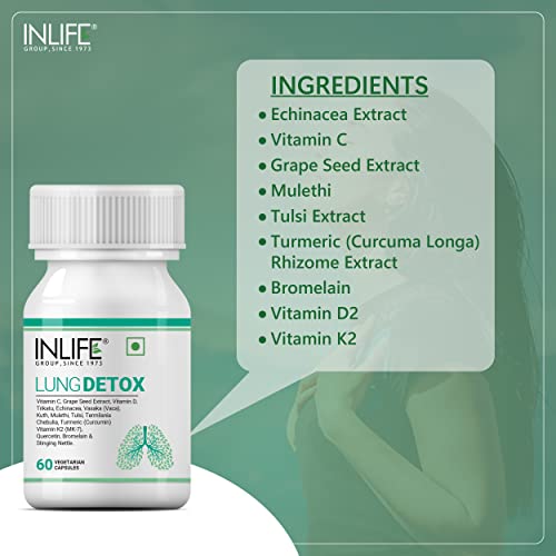 An advanced support formula that has 16 ingredients which work to detox your lungs. This supplement supports lung health. Formulated with active ingredients like Stinging Nettle Echinacea Quercetin Grape seed extract Mulethi Tulsi Trikatu Turmeric (Curcumin 95% Curcuminoids) Bromelain and Vitamins promotes healthy lungs. Each ingredient and its composition is carefully selected to give you maximum benefits. With pollution household cleaning chemicals making their way into our lungs it is not easy to experience easy breathing. Ingredients like Stinging Nettle Echinacea Bromelain and Quercetin provides support to lung tissues for healthy functioning. These vegetarian capsules contain ingredients including Stinging Nettle Echinacea Quercetin 95% Grape Seed Kuth Mulethi Tulsi Termilania Chebulia Termilania ballirica Trikatu Turmeric (Curcumin) Bromelain and Vitamins. This unique advanced formula offers numerous health benefits making it ideal for both men and women who are aiming for healthy lungs. Suggested Usage: As a dietary supplement take two (2) capsules together once a day after meal with a full glass of water or as directed by your healthcare professional. For those with a more sensitive constitution we recommend taking one (1) capsule twice per day after meal with a full glass of water.