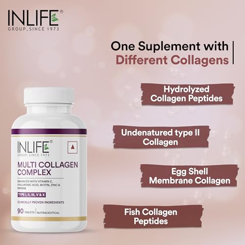 INLIFE Multi Collagen Complex Tablets | 5 Types Peptides I, II, III, V & X with Biotin, Hyaluronic Acid | Collagen Powder Supplements for Women & Men - 90 Tablets (Pack of 2, 180)