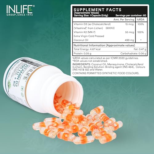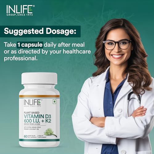 WONDERFUL LICHEN. Lichens are small unique plant species consisting of a symbiotic association of a fungus with an alga. This gives them unique attributes such as surviving in extreme climates and having the ability to grow and accumulate meaningful levels of useful nutrients including Cholecalciferol. ACTIVE FORM & HIGH ABSORPTION. Cholecalciferol is the active form of Vitamin D3 so it provides superior absorption compared to regular Vitamin D3. When taken directly in this format it works more quickly and can be delivered in lower concentrations. Vitamin D3 in liquid filled hard shell vegetarian capsule form is easy to swallow and convenient to take. Some research indicates that vitamin D3 in liquid filled capsule form is more highly bioavailable than powdered or tablet forms. VEGAN & VEGETARIAN SOURCE. Vitamin D3 derived from Lichen is the only vegan source of Vitamin D3. INLIFE Vegan Vitamin D3 supplement is an excellent combination of Lichen Extract Oil and Extra Virgin Cold Pressed Organic Coconut Oil. ACTIVATES THE IMMUNE SYSTEM. In general vitamin D3 functions to activate the immune systems improve immunity and increase circulation. Vitamin D3 helps enhance calcium absorption by regulating concentrations of calcium and phosphorus in the body to provide essential support for bones and teeth. Vitamin D3 (termed the 'sunshine vitamin') is the same biologically active form of Vitamin D you get from the sun's UVB rays. With this complex you will get the benefits without the burn. QUALITY. At INLIFE Healthcare we take pride in providing just the right number of high-quality ingredients for maximum results - no more no less. Just one small easy-to-swallow liquid filled hard shell vegetarian capsule per day provides 600 IU of D3 helping you support strong bones and healthy immune system.