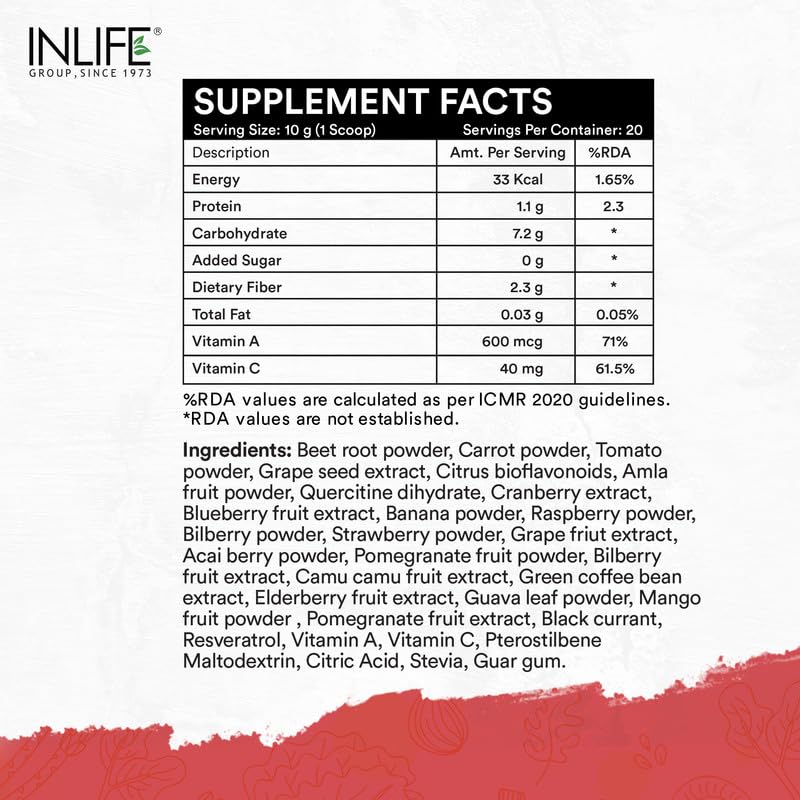 INLIFE Super Reds Powder | Antioxidant-Rich Superfood Supplement Drink Mix | 20 Super Fruits, Beets & Berries | Energize with Powerful Antioxidants Supports Energy 200g (Super Reds)