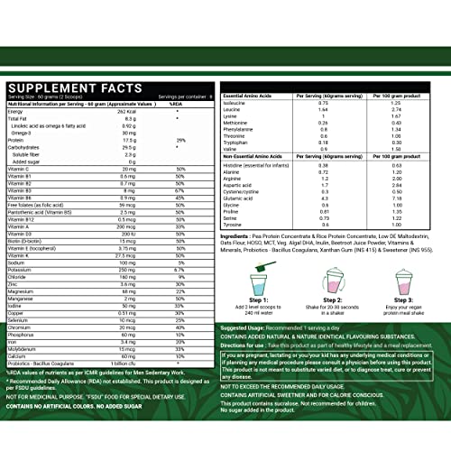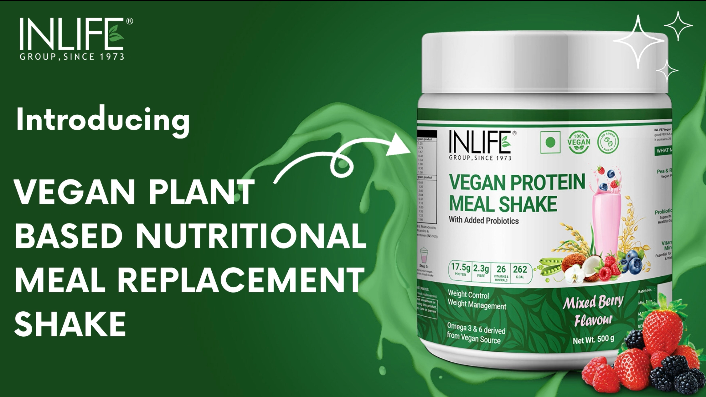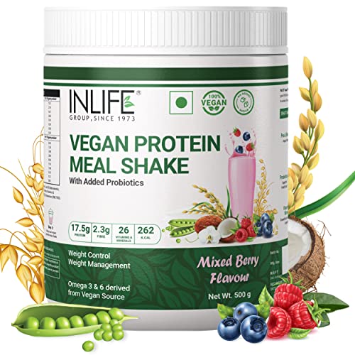 INLIFE Vegan Plant Based Meal Replacement Shake includes 17.5 grams of plant based clean protein (Pea & Rice) 2.3 grams of dietary fiber 26 vitamins & minerals 262 calories per serving. Medium Chain Triglycerides MCT supports lean muscle provides healthy fat and boost energy. Our amino acid infused plant based protein blend promotes complete healthy balance. INLIFE Vegan Meal Replacement Shake is a complete vegan and vegetarian friendly meal on the go for those with little or no time for breakfast lunch or dinner. A perfect way to supplement your daily diet and nutrition needs. This product includes berries that are a rich source of Antioxidants Oats as rich source of fiber and comes with added probiotics to support your gut health. A perfect blend of Pea Protein Concentrate Rice Protein Concentrate and Oats powder having an exceptionally good PDCAA score. It provides Protein Carbohydrates & Fat in a balanced ratio of 2:3:1.