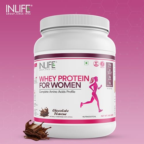 INLIFE Whey Protein Powder for Women Ayurvedic Herbs 23g Protein 21 Vitamins Minerals Omega 3 6 Digestive Enzymes Hair Skin Nails Weight Management & Better Metabolism Support (500g Chocolate)