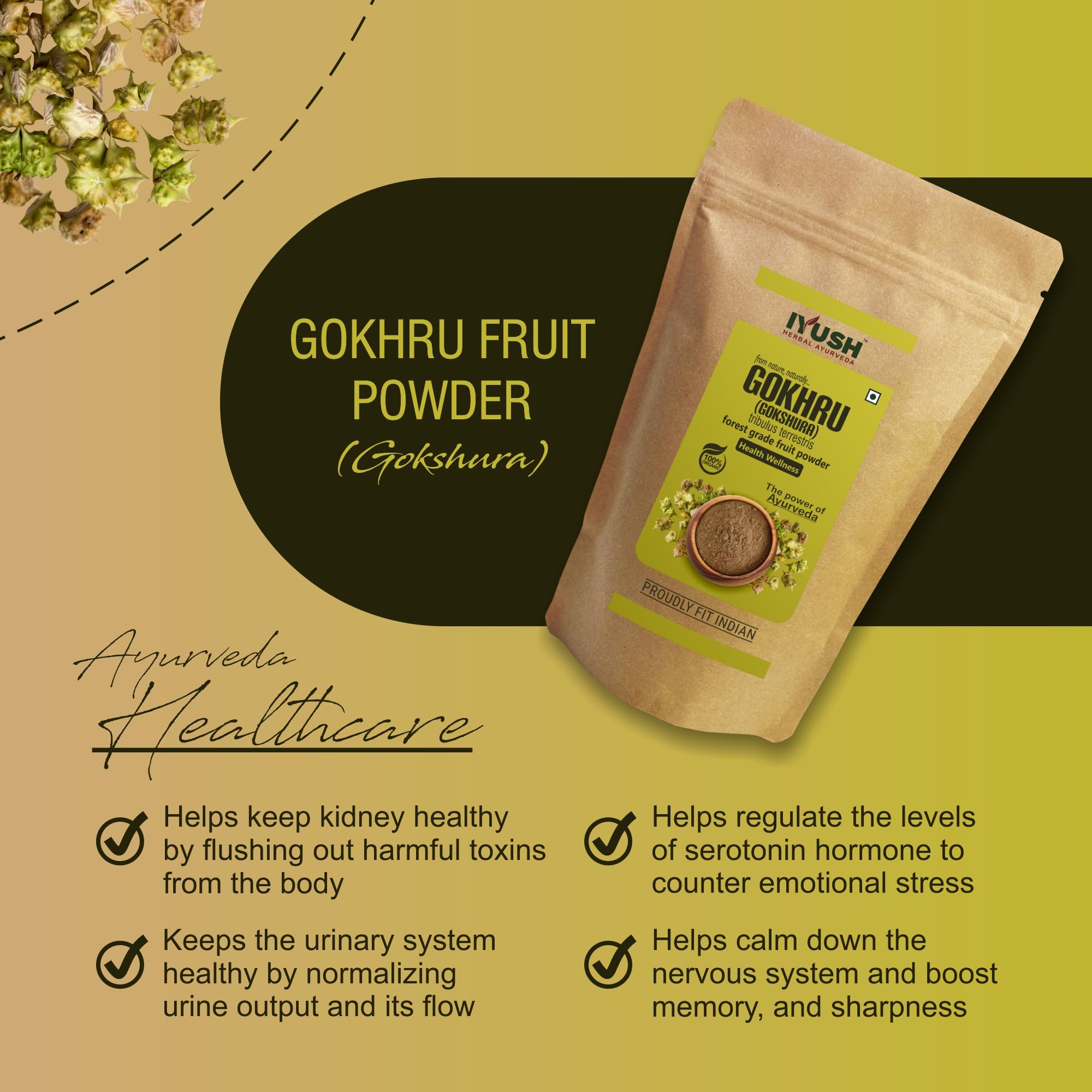 Gokhru or Gokshura also known as Tribulus terrestris is a natural herb that has been used in Ayurveda for centuries for numerous health benefits. It is an organic healthcare powder made from shade-dried wild forest grade Gokhru fruits that contain the highest active nutrients grown naturally without any harmful chemicals or pesticides or fertilizers.