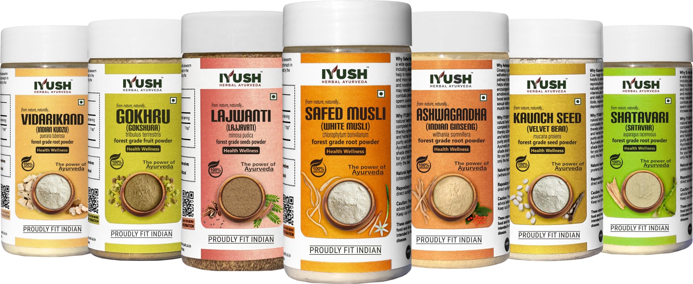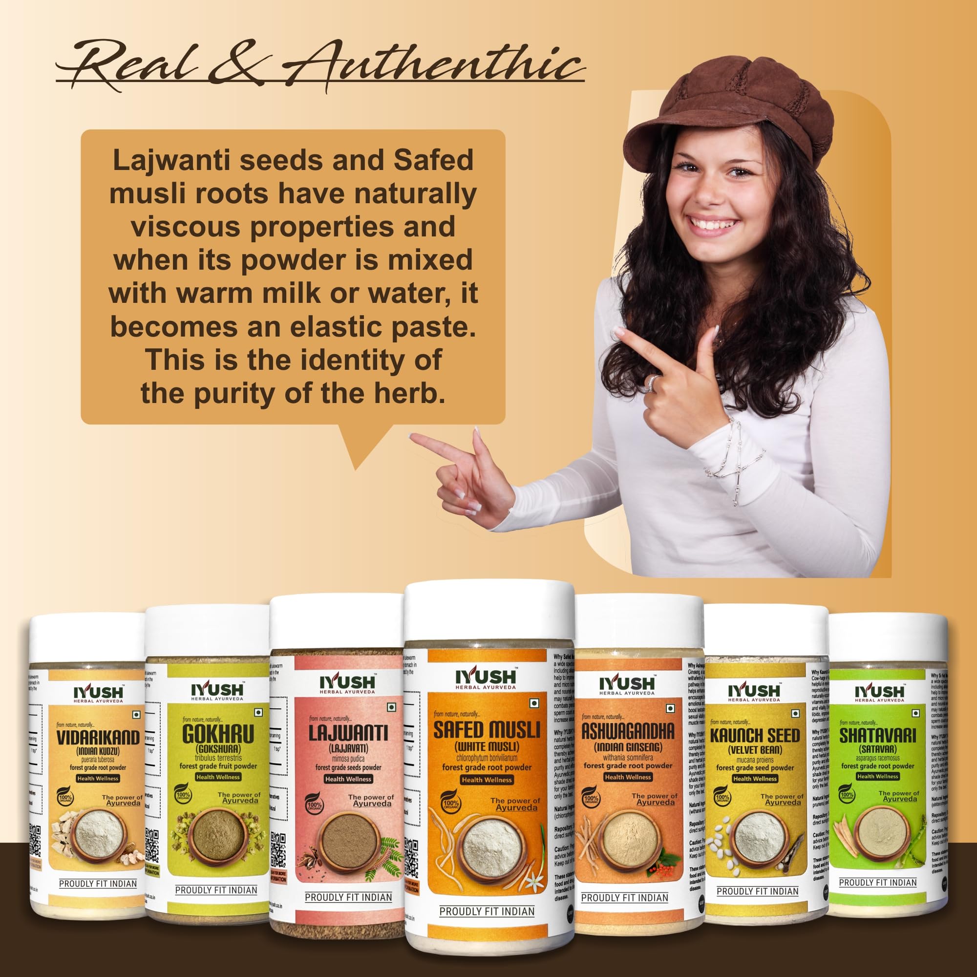 IYUSH Herbal Ayurvedic Safed Musli Ashwagandha Kaunch Beej Shatavari Gokhru Vidarikand And Lajwanti Powder - (Total 700gm) 7 pack of 100gm each