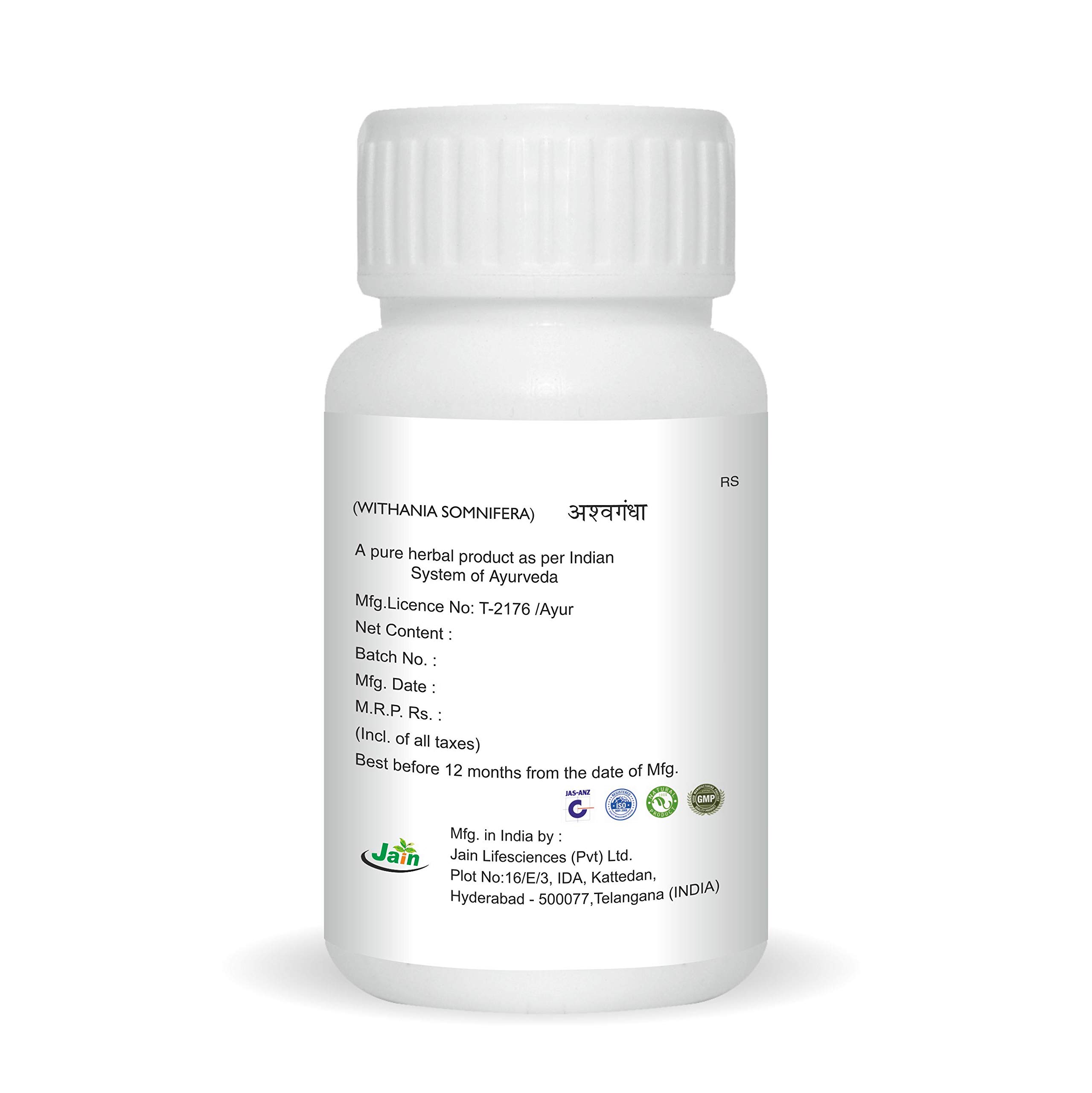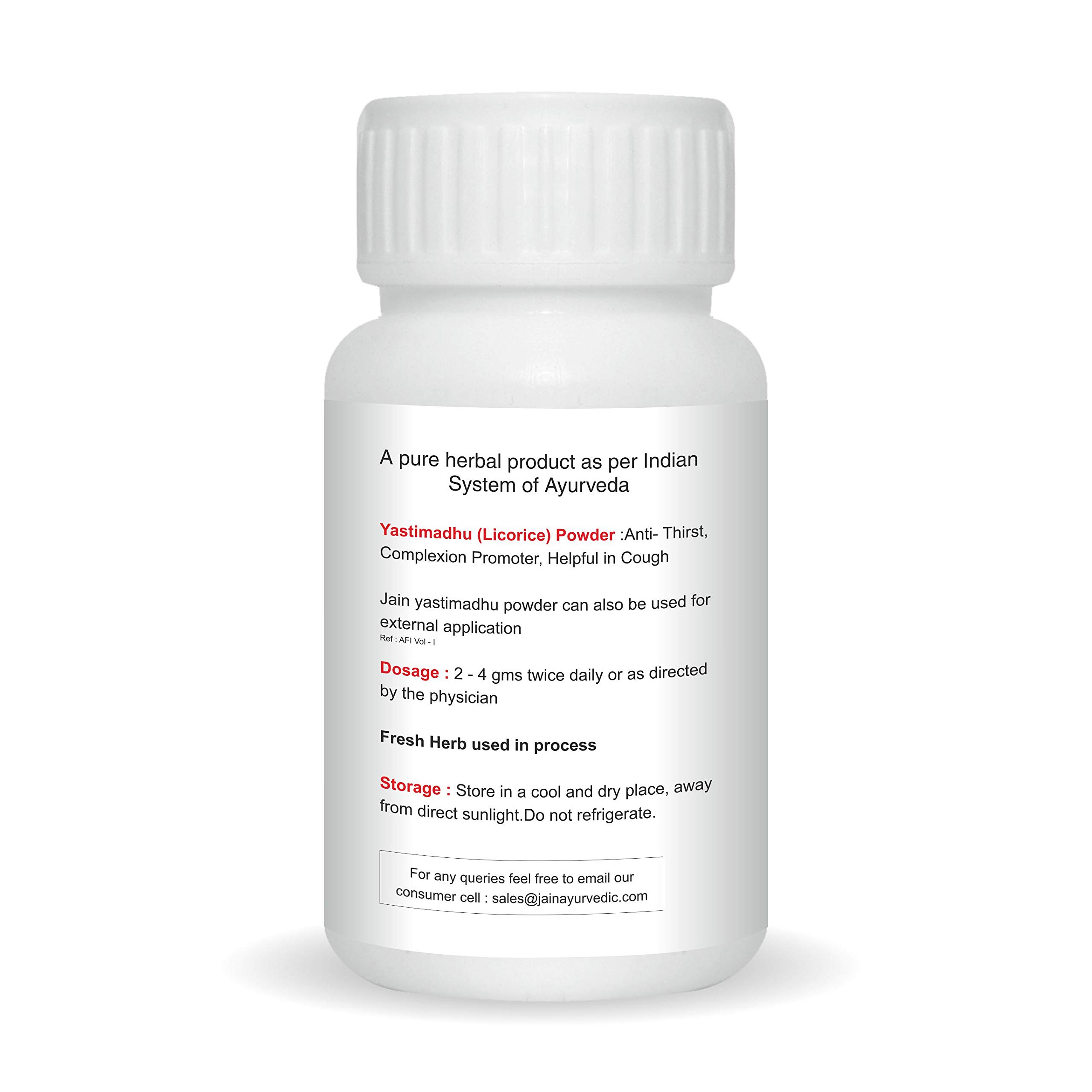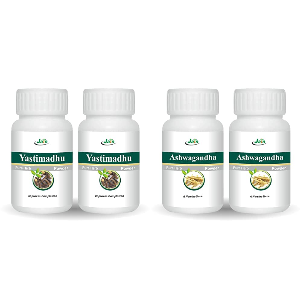 Jain Yastimadhu (Mulethi) Powder 100 g - 2 BottlesYastimadhu known as Mulethi / Licorice Powder is natural of the highest quality and comes with the purity guarantee from the brand. Dried and powdered in a hygiene facility this powder can be used widely in face masks to achieve beautiful radiant skin. The antibacterial and antioxidant properties in it helps to keep the skin free of scars and blemishes.Jain Ashwagandha Powder 100G (Pack Of 2)Ashwagandha (Withania somnifera) is one of the most highly regarded and commonly used adaptogens in the Ayurvedic pharmacopoeia. Maximizing the body's ability to resist stress it enables the body to reserve and sustain vital energy throughout the day while promoting sound restful sleep at night.*This potent herb is used to promote muscle strength and to support comfortable joint movement. It is also used to maintain potency and a healthy libido for it is said to bestow upon its user the vitality and strength of a horse. As a rejuvenative Ashwagandha is particularly useful to seniors and for anyone that would benefit from a nourishing natural source of energy.
