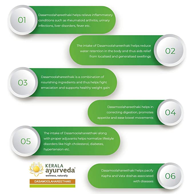 Kerala Ayurveda Dasamoolahareethaki: 250 gmDasamoolahareethaki is Diuretic, Laxative, Lipolytic, Cardiac tonic, Anti-inflammatory, Immuno-modulator.Ingredients:Haritaki Elachi Patra TrikatuLegal Disclaimer: Statements regarding dietary supplements have not been evaluated by the FDA and are not intended to diagnose, treat, cure, or prevent any disease or health condition.Note: May contain additional ingredients. The product description is for information purpose only and it is always better to consume/use products