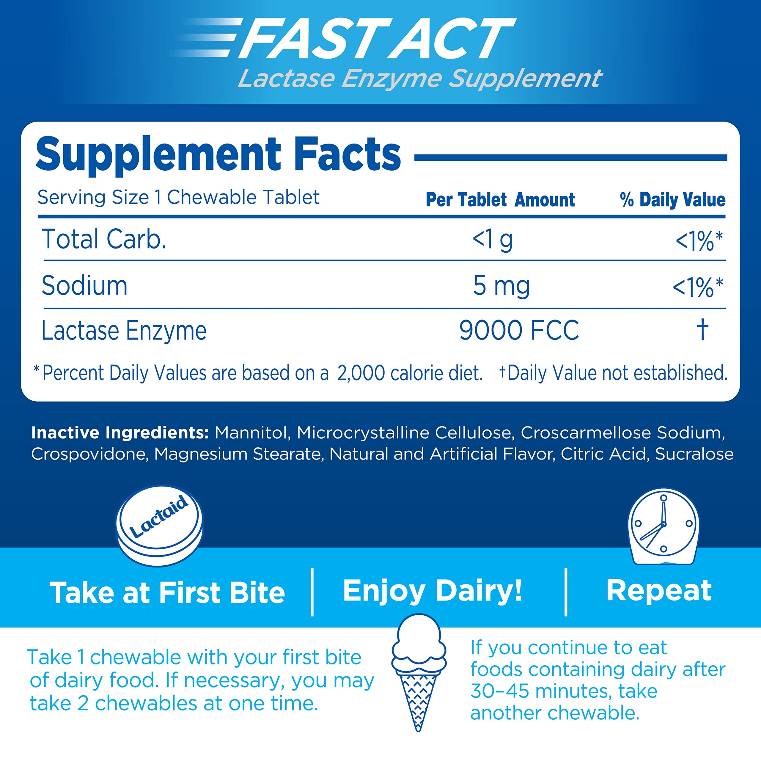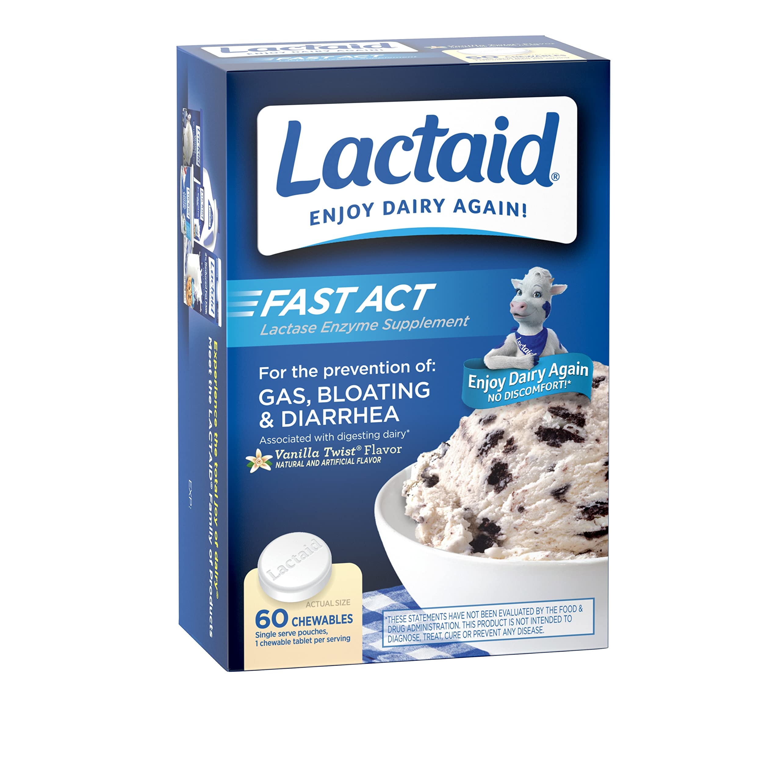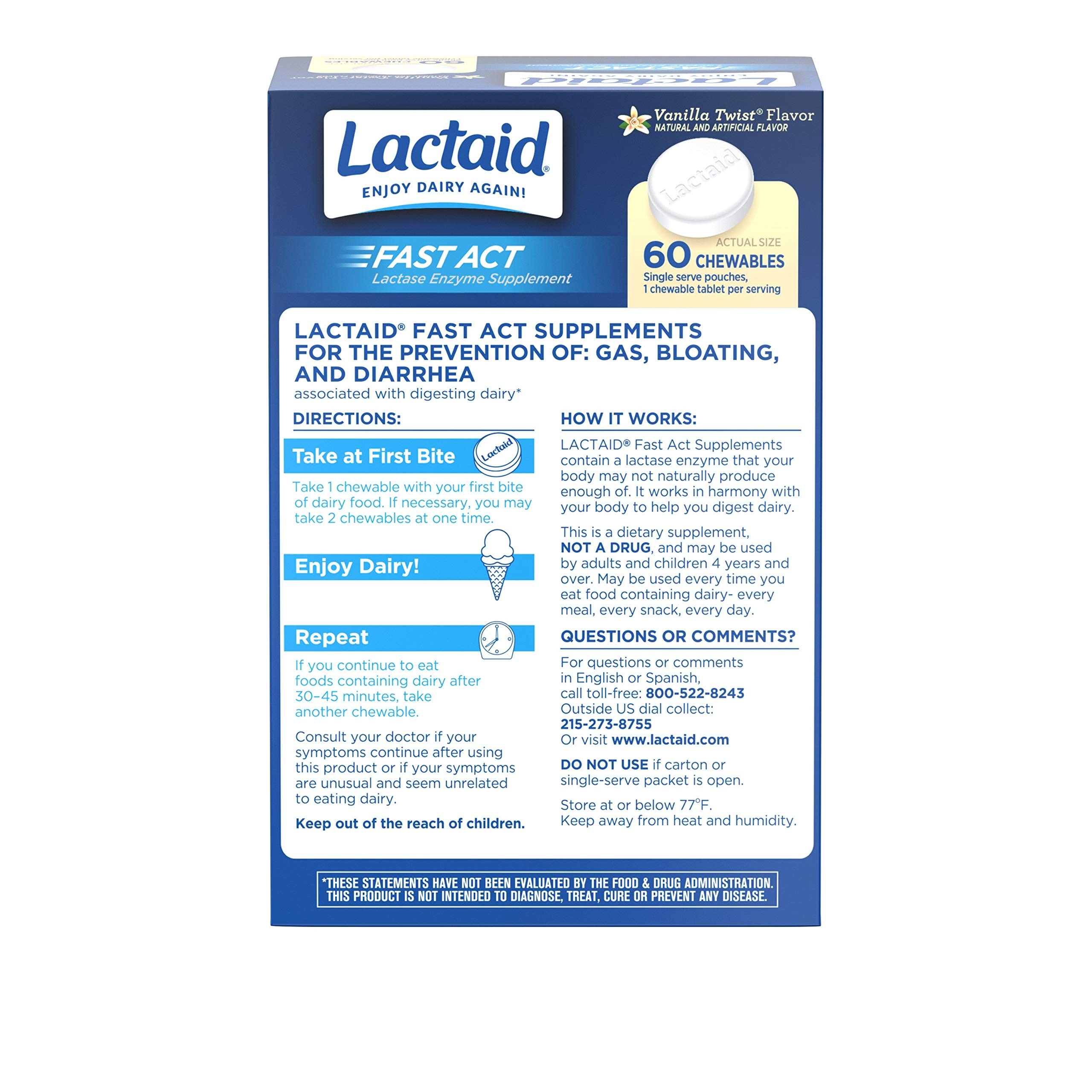 Lactaid Fast Act Chewables with natural lactase enzyme come in a Vanilla Twist flavor and work quickly to make dairy foods easy to digest for those with lactose intolerance or dairy sensitivity so you can enjoy everything on your plate. This digestive supplement helps prevent the gas bloating and diarrhea that many people experience after eating foods containing dairy. The lactase enzymes in this dietary supplement contain 9000 FCC lactase units to help prevent symptoms associated with lactose intolerance by breaking down milk sugar (lactose) so dairy foods are easier to digest. These tasty chewables feature a smooth Vanilla Twist flavor and start working with your first bite or sip of dairy food. Certified kosher and suitable for ages 4 and up Lactaid Fast Act Chewables are available inconvenient individually-wrapped packs making them easily portable for on-the-go dairy relief anywhere anytime.