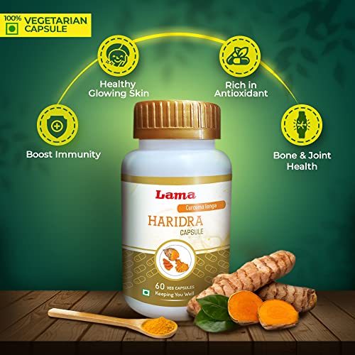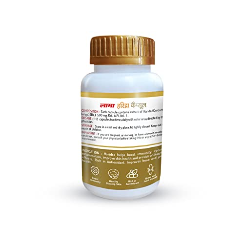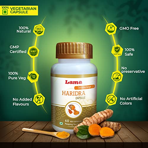 Lama Haridra (Turmeric) Veg Capsule is a uniquely formulated Ayurvedic capsule which has anti-allergic properties and improves immunity. It helps to relieve skin ailments and reduces itching. It helps with hives boils and allergic rhinitis. It is effective in reducing the effects of diabetes on different body organs. It also has anti-inflammatory and antioxidant properties. It improves bone and joint health. It is 100% natural and safe. It contains no preservatives no added flavour no artificial colour and is GMO free.