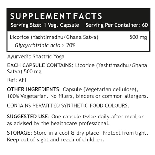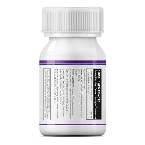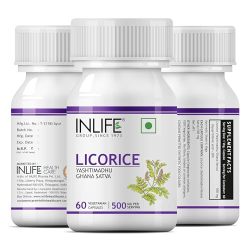 SUPPORTS HEALTHY DIGESTIVE FUNCTION: INLIFE Licorice capsules promotes healthy gastric and duodenal tissue. It is commonly used to help soothe the digestive tract. It supports normal bowel function and maintains normal GI tract functions. OTHER BENEFITS: Licorice can help relieve the pain associated with acid reflux and heartburn. It supports healthy adrenal function promotes endurance & vitality. It also supports healthy immune function. 20% GLYCYRRHIZINIC ACID: Each capsule contains 500 mg of pure Licorice / Yastimadhu / Glycyrrhiza Glabra extract standardized to 20% Glycyrrhizuinic acid per vegetarian capsule. As a dietary supplement take 1 capsule 1 to 2 times daily between meals with full glass of water or as directed by your healthcare professional. For those with more sensitive constitution we recommend taking one (1) capsule daily between meals with full glass of water. PURITY & POTENCY: Our product contains the most natural and effective formulation of trusted natural ingredient that is carefully processed and manufactured in a GMP certified manufacturing facility so you can be sure that you're safe. We offer best quality products for the best value. QUALITY: Consider ordering one bottle for yourself and another for a friend or loved one. Keep each other motivated and reach your goals together and more quickly. INLIFE Healthcare stands by every quality product they make. We manufacture only premium and extra pure but high potency vitamins capsules tablets powders multivitamins herbal supplements and natural herbal skin & personal care products for men women and children. Check INLIFE Healthcare out today!