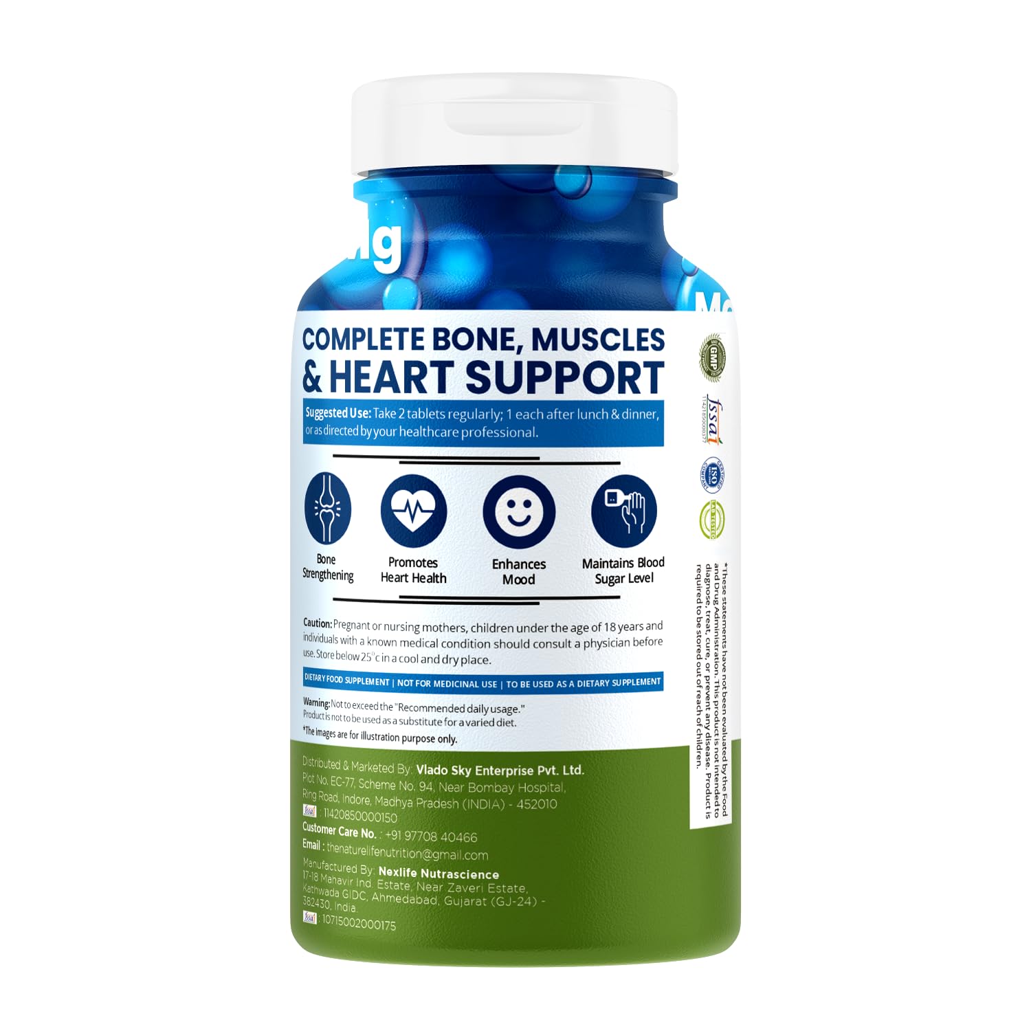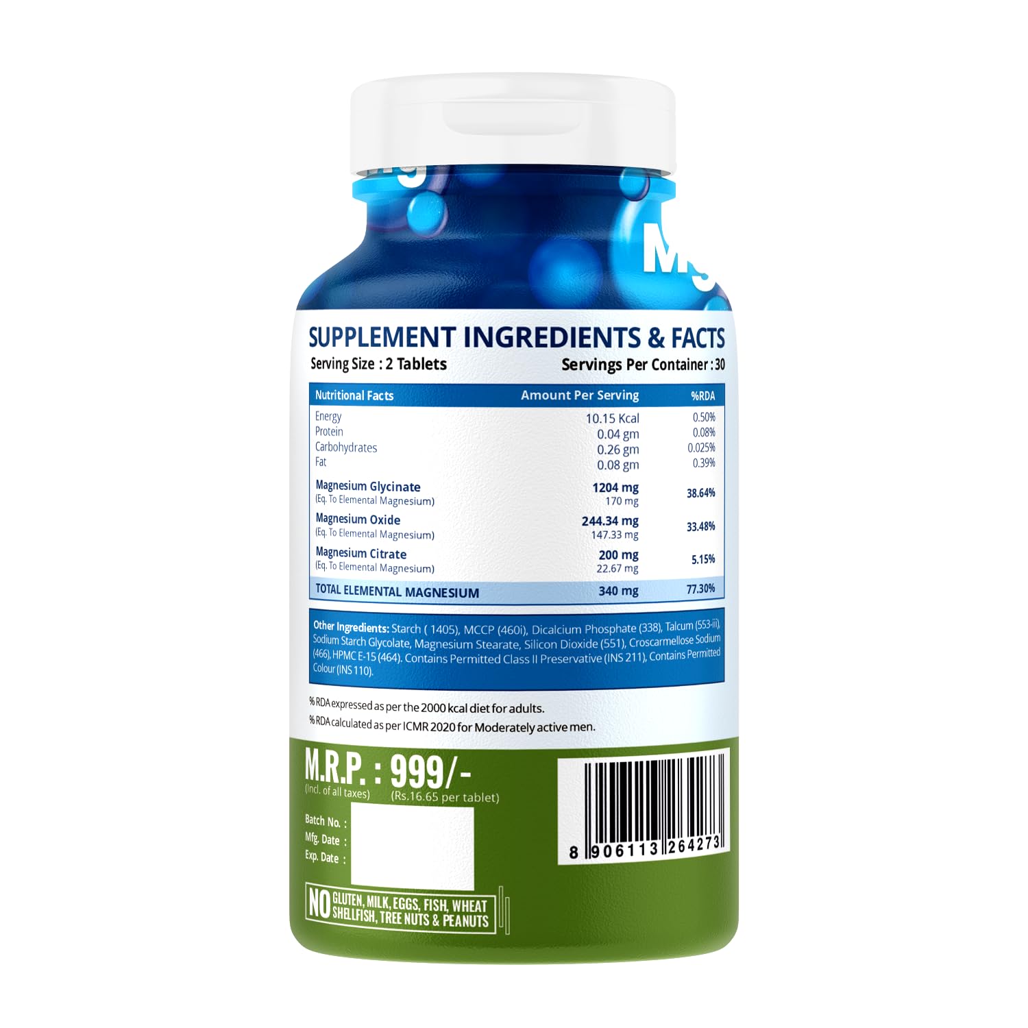 Triple Magnesium Nourishment for your Enrichment! Magnesium is essential for the smooth functioning of your body. In fact Magnesium is involved in almost all reactions in your body right from energy creation protein formation gene maintenance muscle movements nervous system regulation to managing inflammation. Despite so many advantages you are unable to fulfill this daily requirement through your unplanned diet. But now no more! Magnesium Complex Supplement is here with triple magnesium enrichment for strong bones a happy mood a healthy heart and stress-free life.