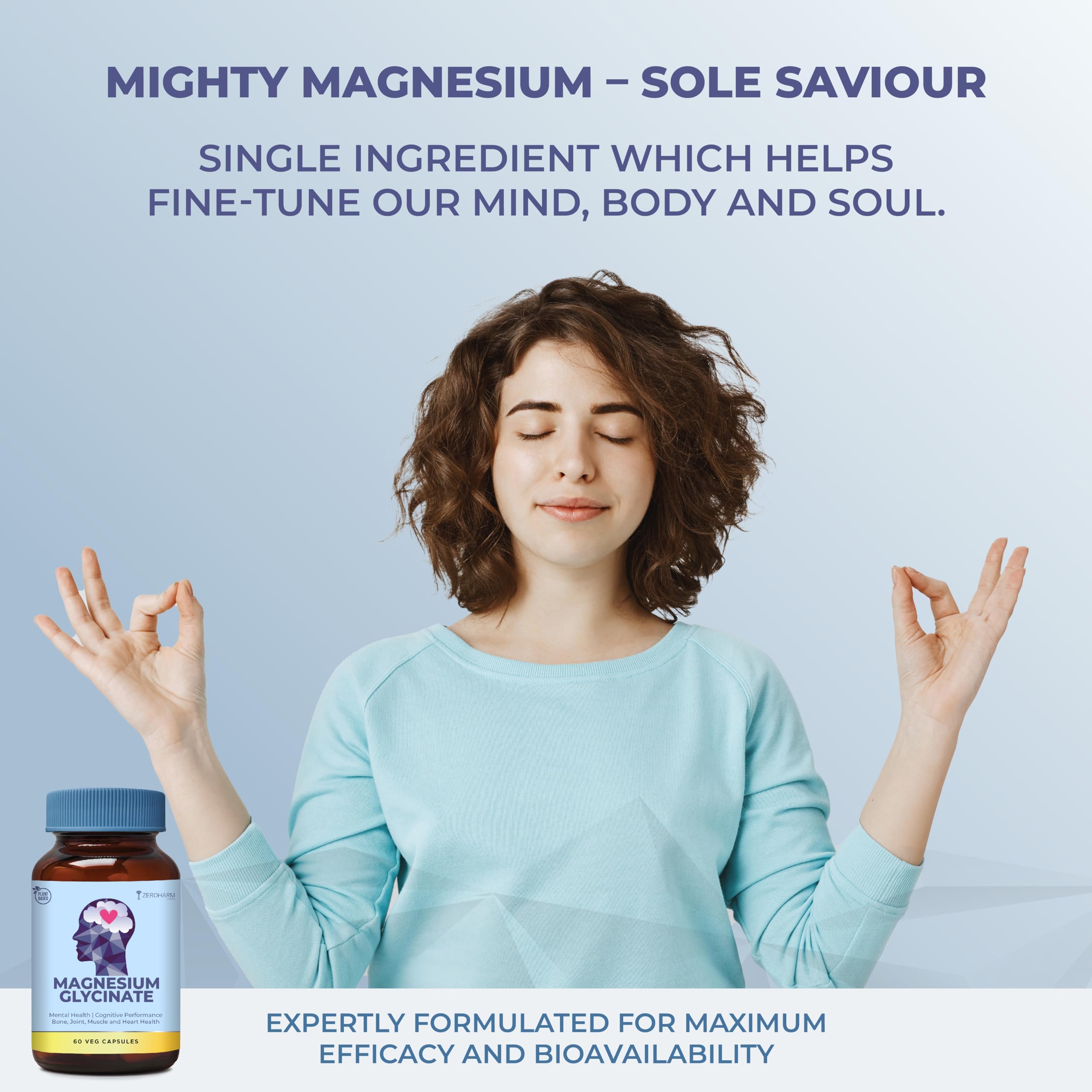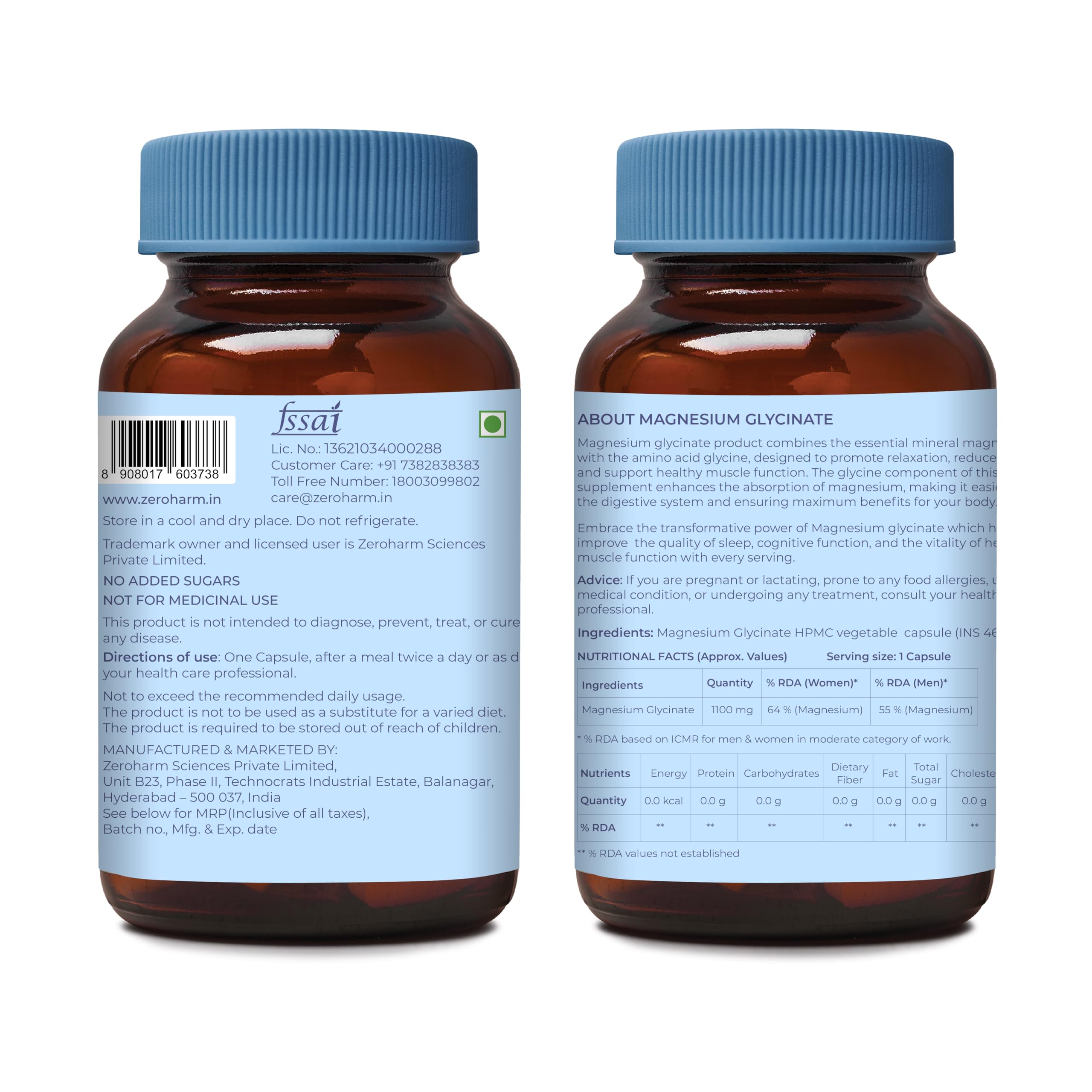 Magnesium Glycinate 1100mg with Moringa Extract - For Stress Sleep Muscle Relaxation Bone & Heart Health - High Absorption - Plant-Based Supplement for Men & Women - 60 Veg Capsules - By ZEROHARM