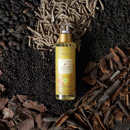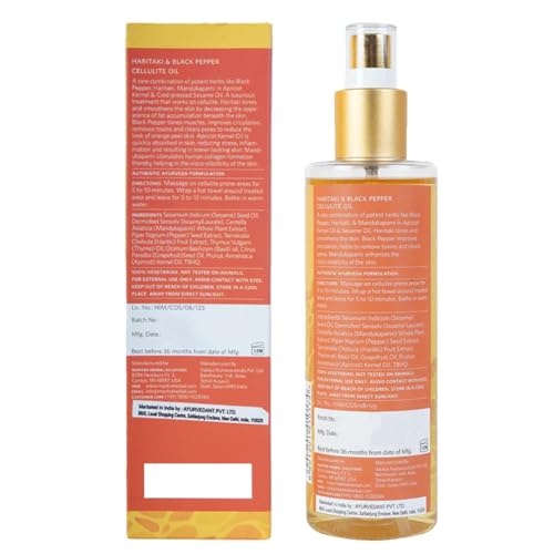 A rare combination of potent herbs like Black Pepper Haritaki and Mandukaparni in Apricot Kernel and sesame Oil this therapeutic oil helps smooth out cellulite. Haritaki tones the skin while Black Pepper improves blood circulation and clears the pores. Apricot Kernel Oil reduces stress and inflammation and Mandukaparni stimulates human collagen formation resulting in leaner-looking skin. With regular use fat accumulation beneath the skin is reduced improving the skin elasticity.