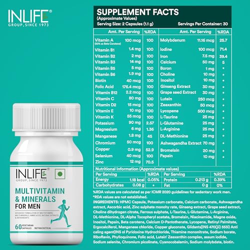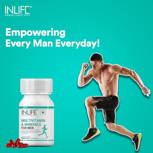 INLIFE Multivitamin & Minerals Capsules for Men provides the perfect number of vitamins minerals antioxidants specially designed for leading concerns of men. It helps to maintain a healthy body with overall wellness. Enrich your diet with Quality vitamins & minerals. Energize and supercharge your activities without caffeine or sugar. Contains 25 essential vitamins & minerals in an advanced formula along with amino acids L-Taurine L-Glutamine DL-Methionine & L-Arginine natural extracts of Ginseng Grape Seed Ashwagandha and added benefits of Alpha Lipoic Acid Lycopene Lutein & Zeaxanthin. Offers immune support increased energy and mental alertness by providing your body with all it needs. It supports heart health bones nervous & hormones system. Our blend of essential vitamins and minerals is believed to support nutritional balance promote optimal health boost energy and stamina levels. Complete pure vitamins and mineral combination with size â¬Ë0' capsule means easy to swallow. 1-month supply of 60 capsules made according to the GMP standards. As a dietary supplement take two (2) capsules together once a day after breakfast with a full glass of water or as directed by your healthcare professional. For those with a more sensitive constitution we recommend taking one (1) capsule twice per after meal with a full glass of water. Consider ordering one bottle for yourself and another for a friend or loved one. Keep each other motivated and reach your goals together and more quickly. INLIFE Healthcare stands by every quality product they make. We manufacture only premium and extra pure but high potency vitamins capsules tablets powders multivitamins herbal supplements and natural herbal skin & personal care products for men women and children. Check INLIFE Healthcare out today!.