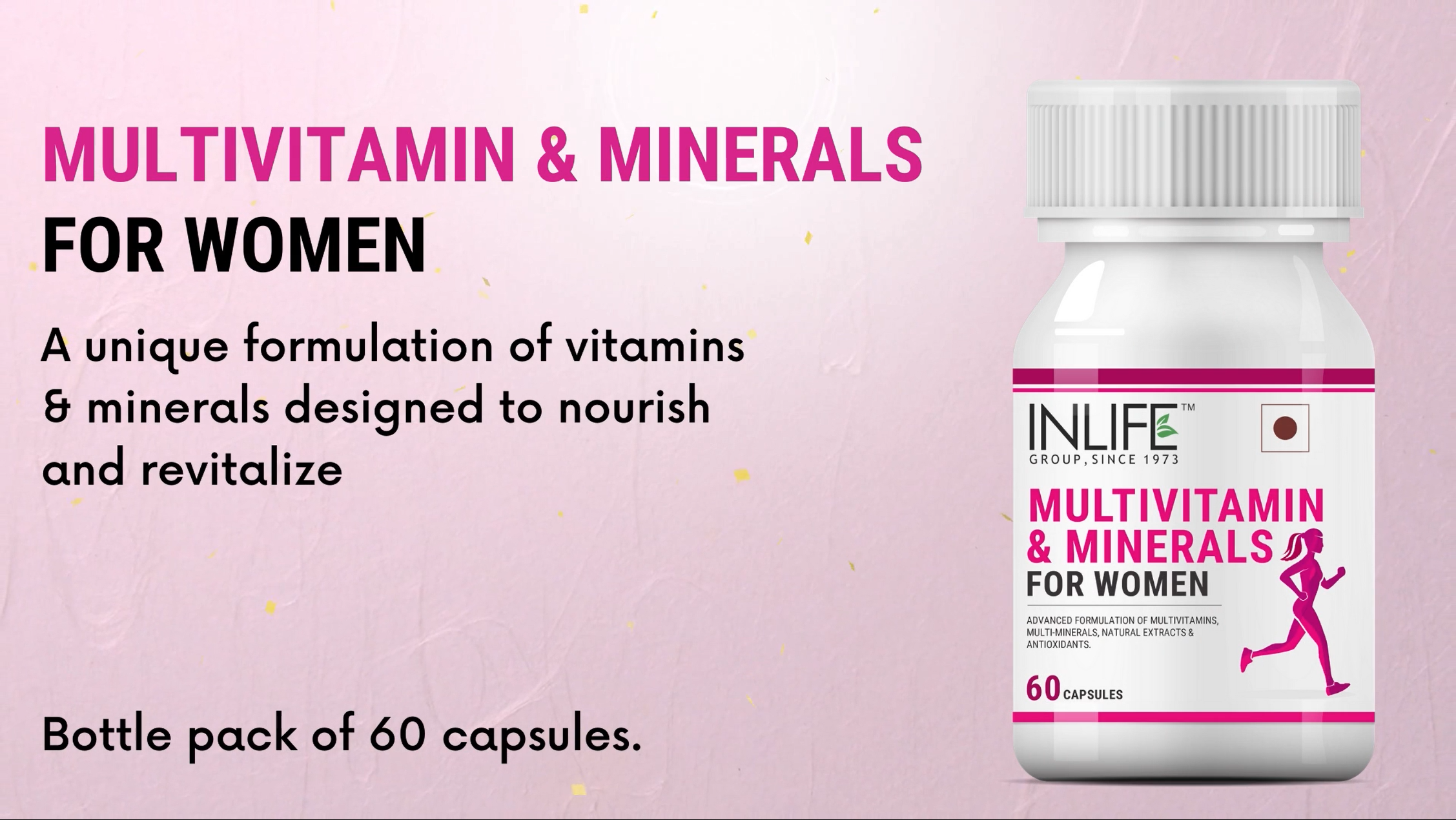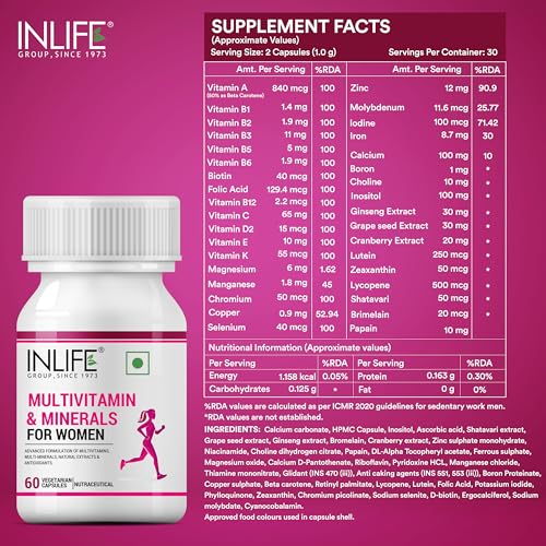 INLIFE Multivitamin & Minerals Capsules for Women provides the perfect number of vitamins minerals antioxidants specially designed for leading concerns of women. It helps to maintain a healthy body and immunity with vitamin A C E and selenium. Enrich your diet with Quality vitamins & minerals. Contains 24 essential vitamins & minerals in an advanced formula along with natural extracts of Ginseng Grape Seed Cranberry and Shatavari. Apart from this speciality ingredients it also contains Lutein Zeaxanthin Alpha Lipoic Acid and Lycopene. Offers immune support increased energy and mental alertness by providing your body with all it needs. It supports heart health bone health eye health daily energy and immune health. Our blend of nutrient diverse women's vitamin and minerals formula is believed to support nutritional balance and helps convert food into energy. Complete pure vitamins and mineral combination with size â¬Ë0' capsule means easy to swallow. 1-month supply of 60 capsules made according to the GMP standards. As a dietary supplement take two (2) capsules together once a day after breakfast with a full glass of water or as directed by your healthcare professional. For those with a more sensitive constitution we recommend taking one (1) capsule twice per after meal with a full glass of water. Consider ordering one bottle for yourself and another for a friend or loved one. Keep each other motivated and reach your goals together and more quickly. INLIFE Healthcare stands by every quality product they make. We manufacture only premium and extra pure but high potency vitamins capsules tablets powders multivitamins herbal supplements and natural herbal skin & personal care products for men women and children. Check INLIFE Healthcare out today!