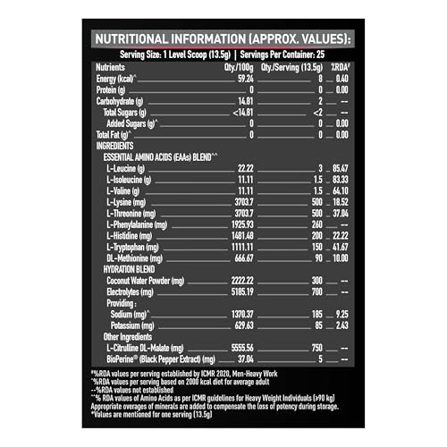 Fast muscle recovery is one of the most important aspects of bodybuilding as it helps you stay on track and keep achieving new fitness milestones faster as compared to the long recovery time in-between the exercises. Along with ample rest and a good workout routine your body also needs great nutritional support that can help you power through each workout session. Get good muscle pumps instant energy stamina and strength with the power of 9 Essential Amino Acids in MuscleBlaze EAA 8000 the best EAA supplement on the market. Essential Amino Acids are among the most widely used supplements as they are easily absorbed and give your body the fuel that it needs to perform at its best abilities each time. MuscleBlaze EAA 8000 intra workout supplement is formulated especially keeping the constitution of your muscles in mind to support faster recovery. This vegan intra workout supplement for men and women provides 8 g of EAAs comprising BCAAs (Leucine Isoleucine & Valine) in a ratio of 2:1:1 in each serving. The unique hydration blend keeps you hydrated and energized for longer workouts. This EAA BCAA supplement is enriched with Citrulline & Bioperine which help in enhanced pumps and absorption of nutrients respectively. It has no added sugar or trans fat & contains immunity boosters Zinc and Vitamin C. Enjoy it in two refreshing flavours - Razz Lemonade Blue Cola & Melon Martini.