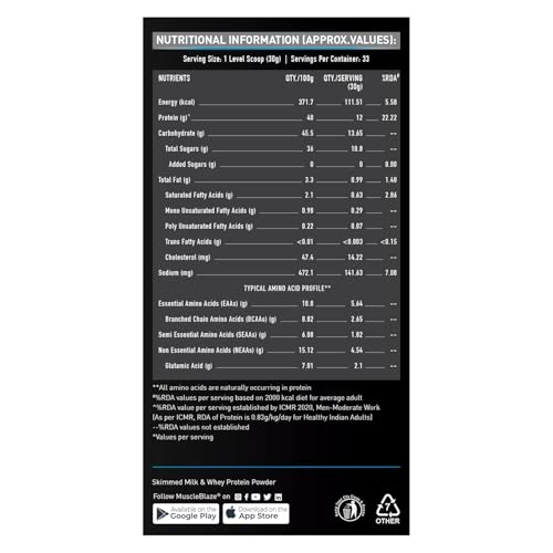 • 40% PROTEIN: Get 40% of protein i.e. 12 g protein per 30 g serving with 5.5 g EAAs and 2.6 g BCAAs to help keep the body in an anabolic state to improve muscle gains and reduce muscle loss. Whey Protein Concentrate is the primary source of protein in this