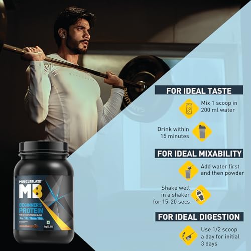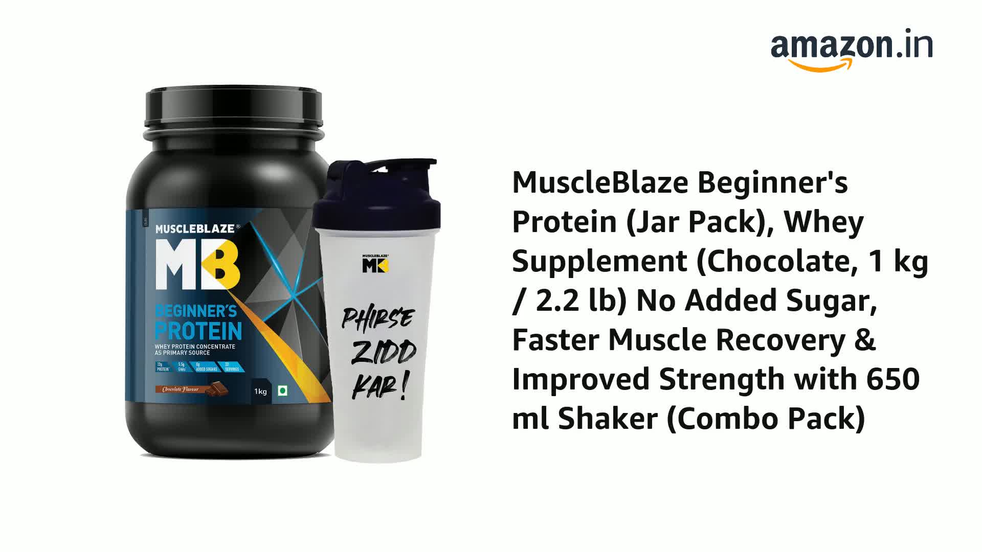 MuscleBlaze Beginner's Protein (Jar Pack), Whey Supplement (Chocolate, 1 kg / 2.2 lb) No Added Sugar, Faster Muscle Recovery & Improved Strength with 650 ml Shaker (Combo Pack)