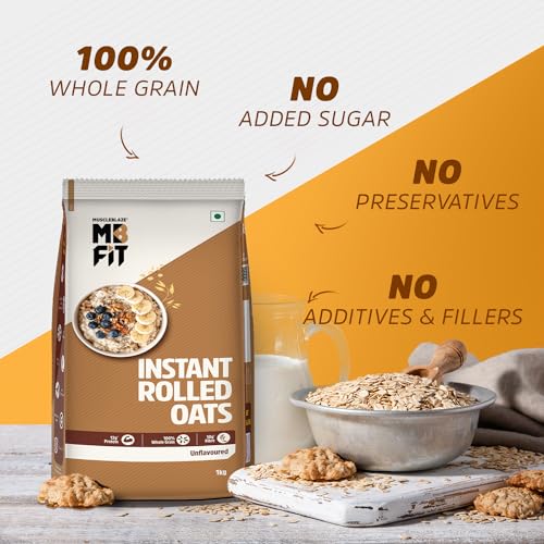 • HIGH-FIBRE ROLLED OATS: MuscleBlaze Fit Instant Oats provides 10.51 g of dietary fibre per 100 g of serving so that you enjoy greater satiety and stay active for longer. Fibre also improves digestion