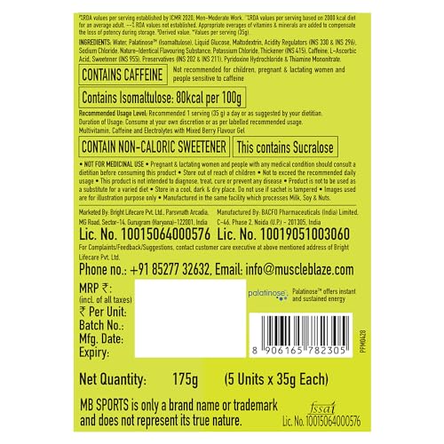 MuscleBlaze Sports Energy Gel for Instant Energy Boost (Mixed Berry, 35g, Pack of 5) | With 500mg Electrolytes & 75mg Caffeine
