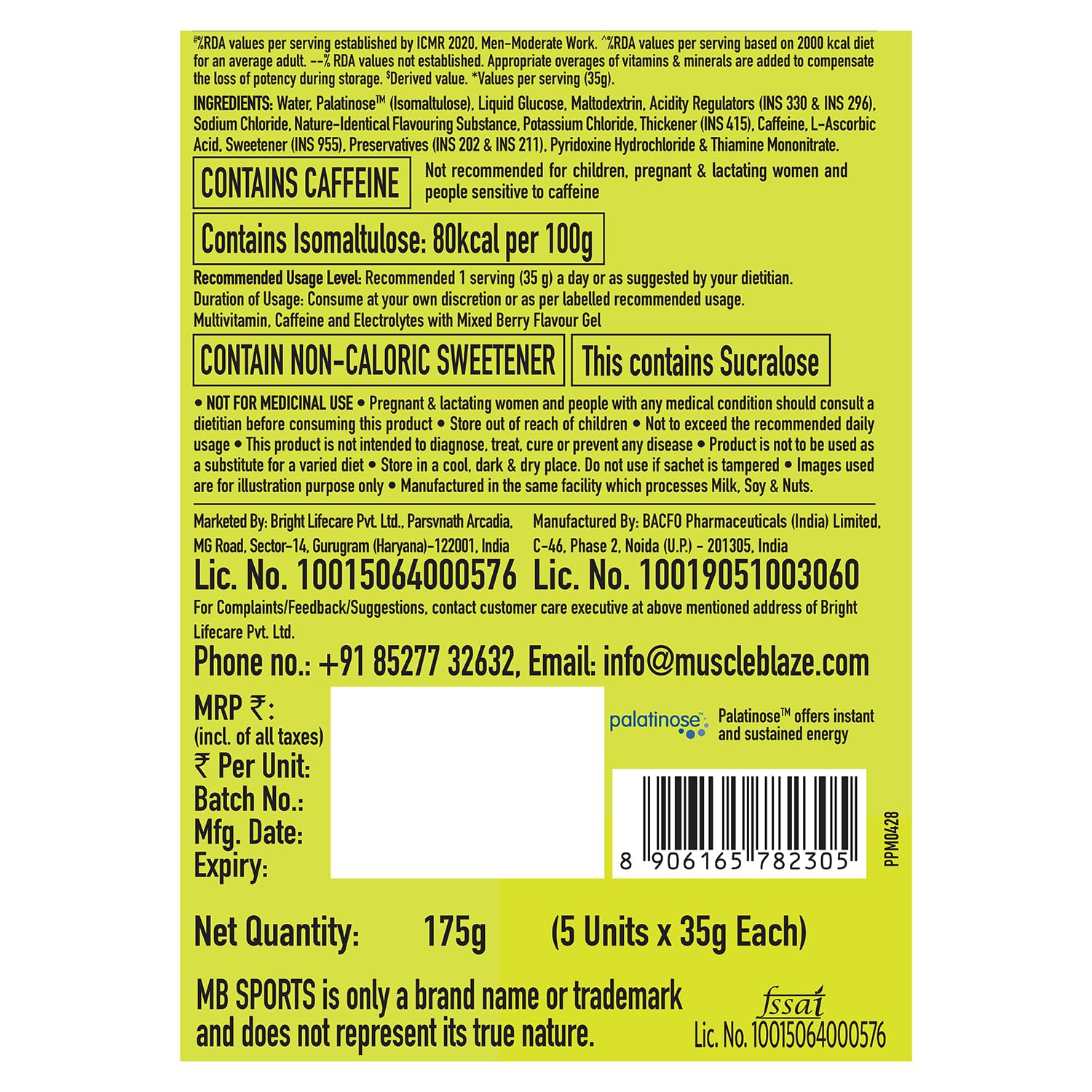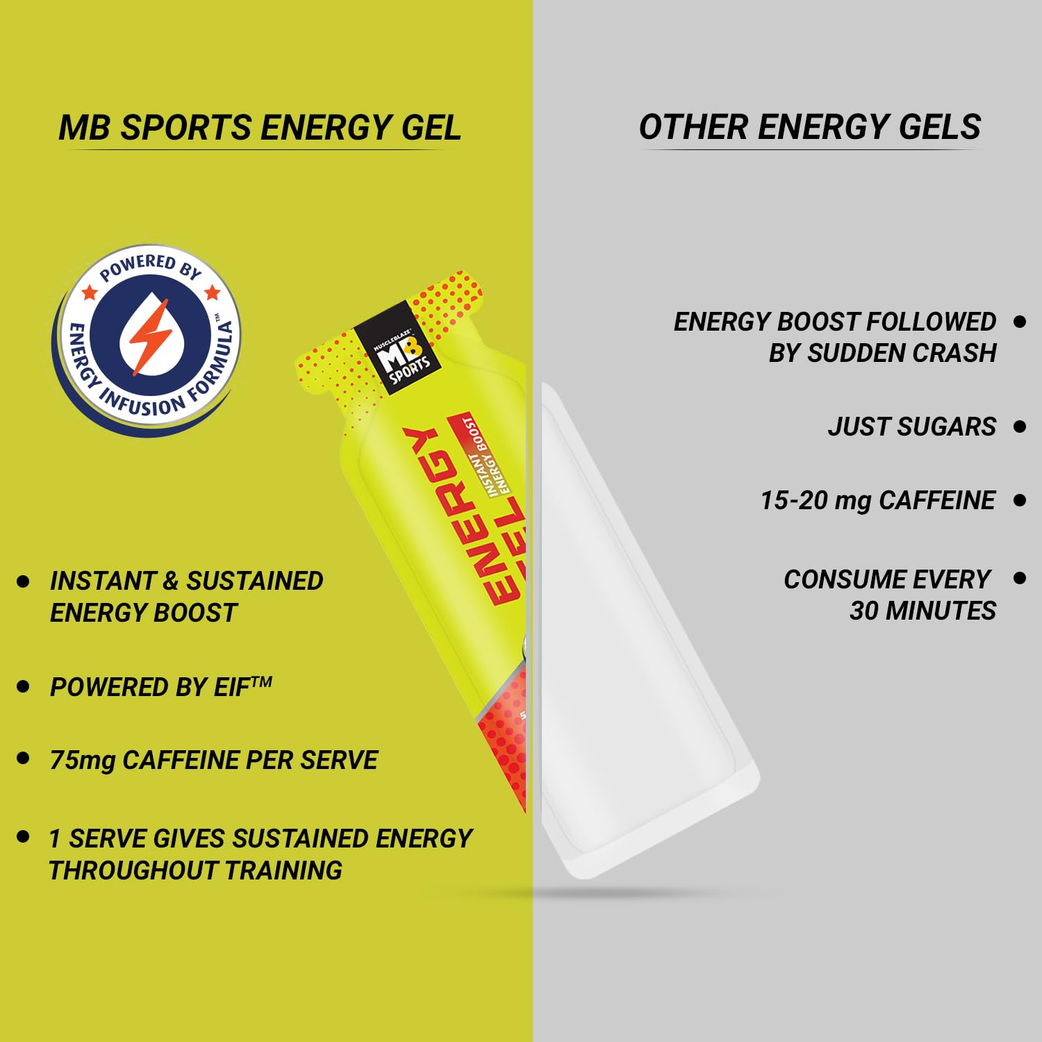 • Experience long-lasting energy with EIFTM: Unlike ordinary energy sources MB Sports Energy Gel’s Energy Infusion Formula combines liquid glucose for immediate energy and PalatinoseTM for sustained release helping you crush your fitness endeavours withou